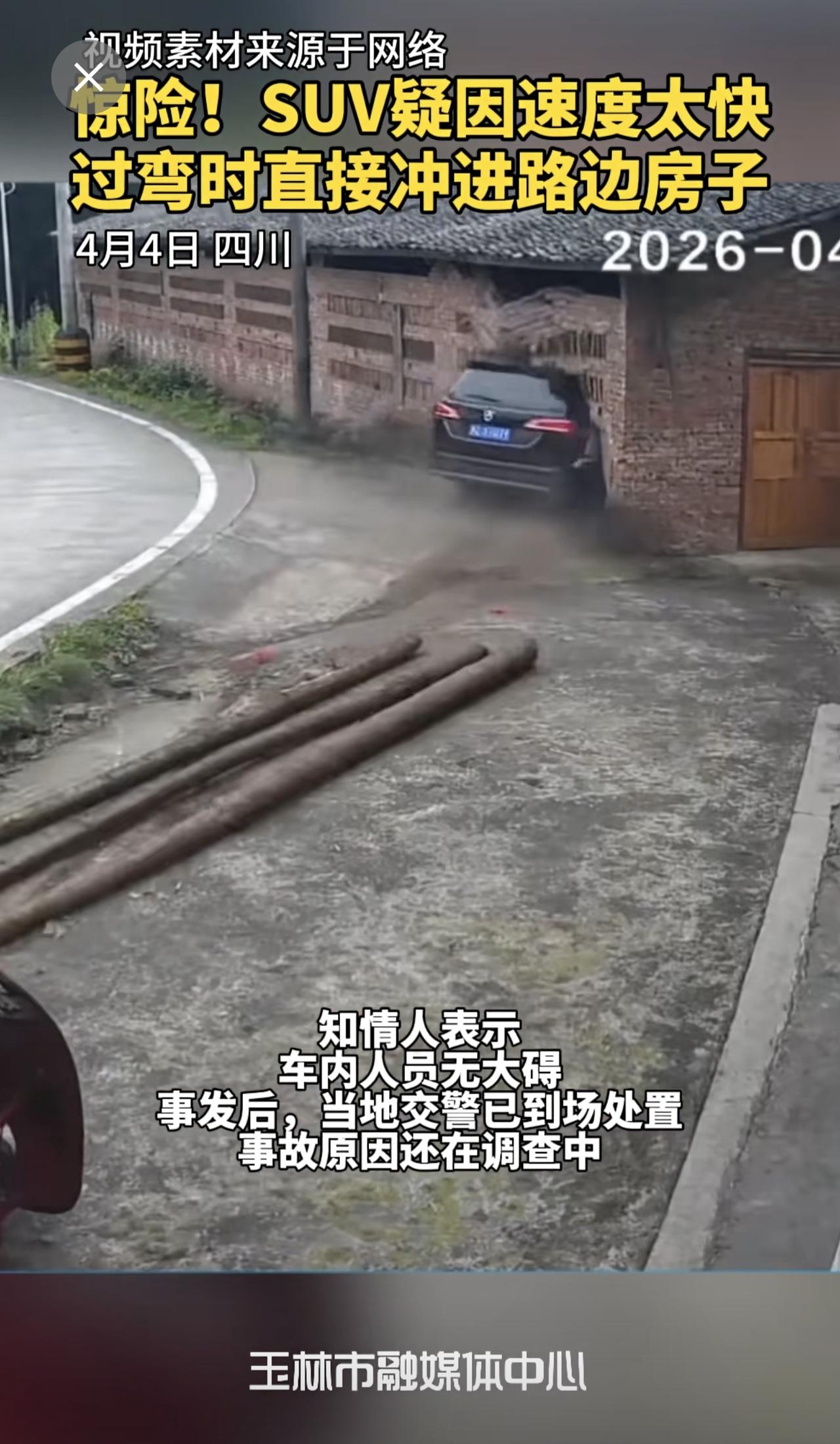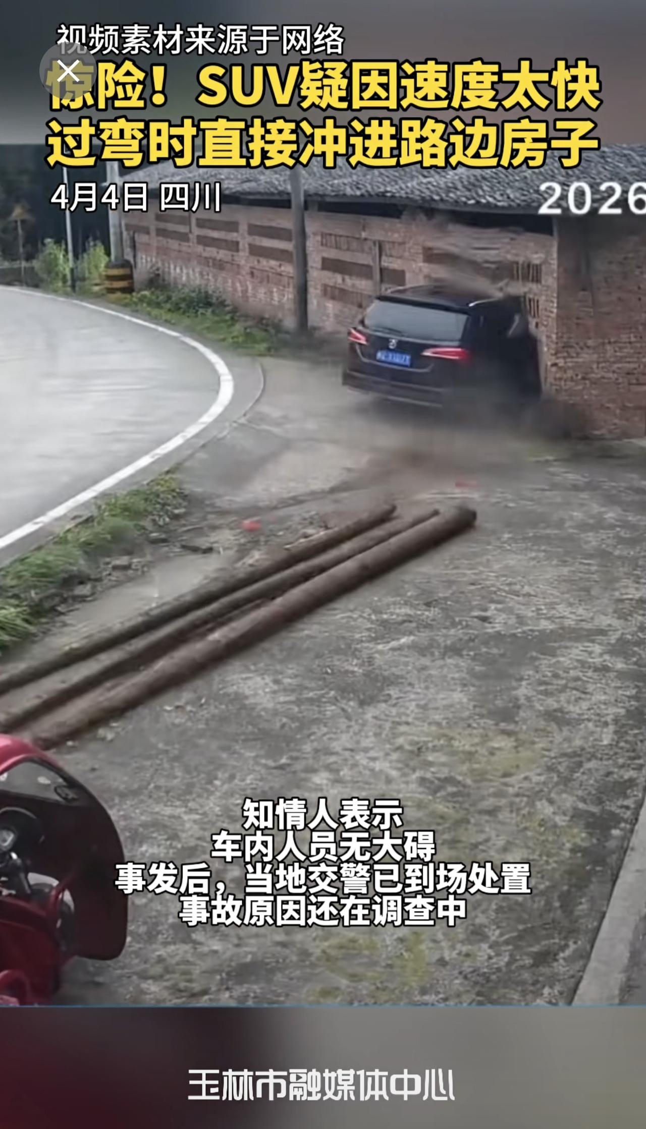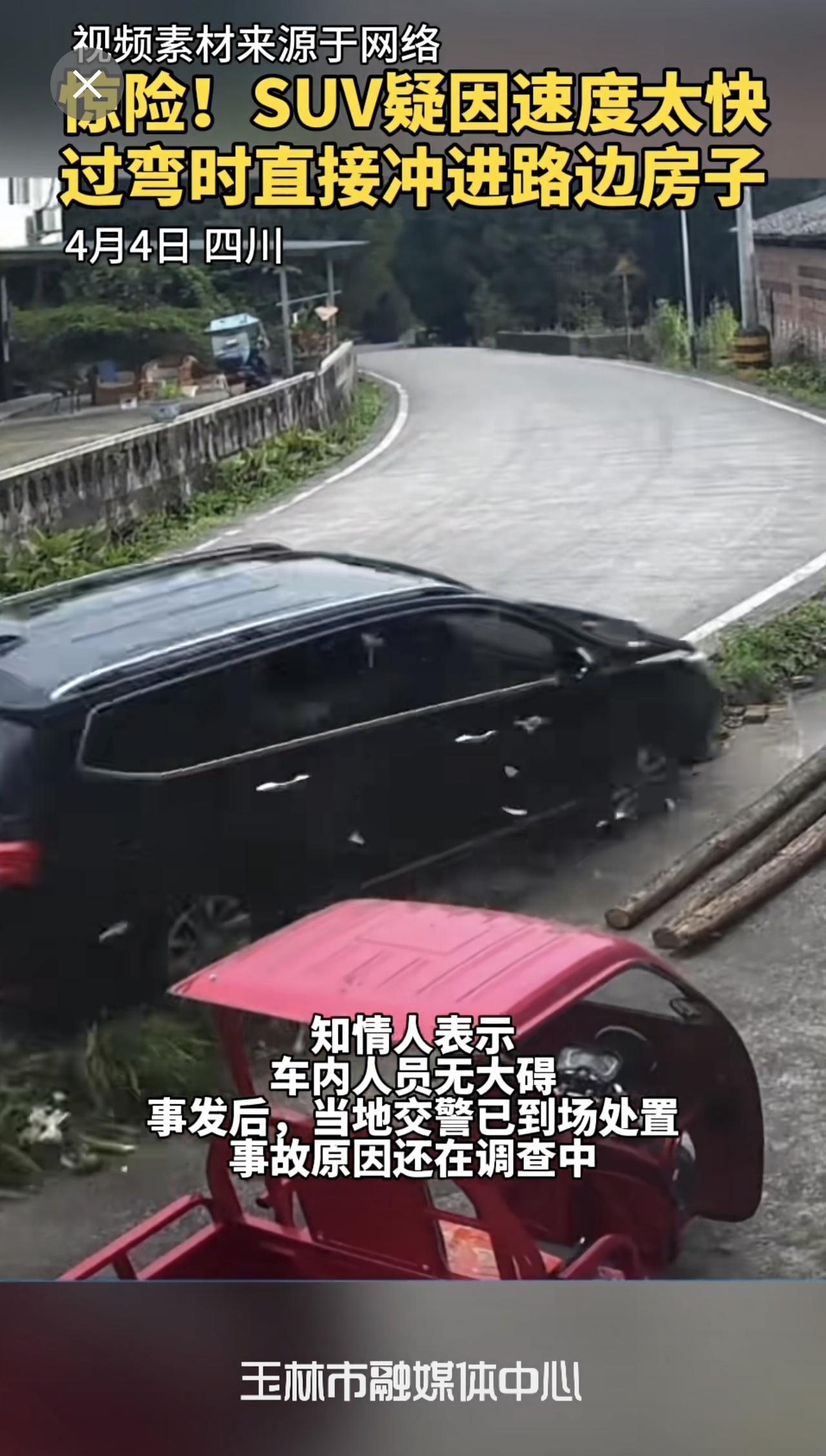惊险!SUV疑因速度太快,过弯时直接冲进路边房子,房子瞬间崩塌,万幸的是人没事。