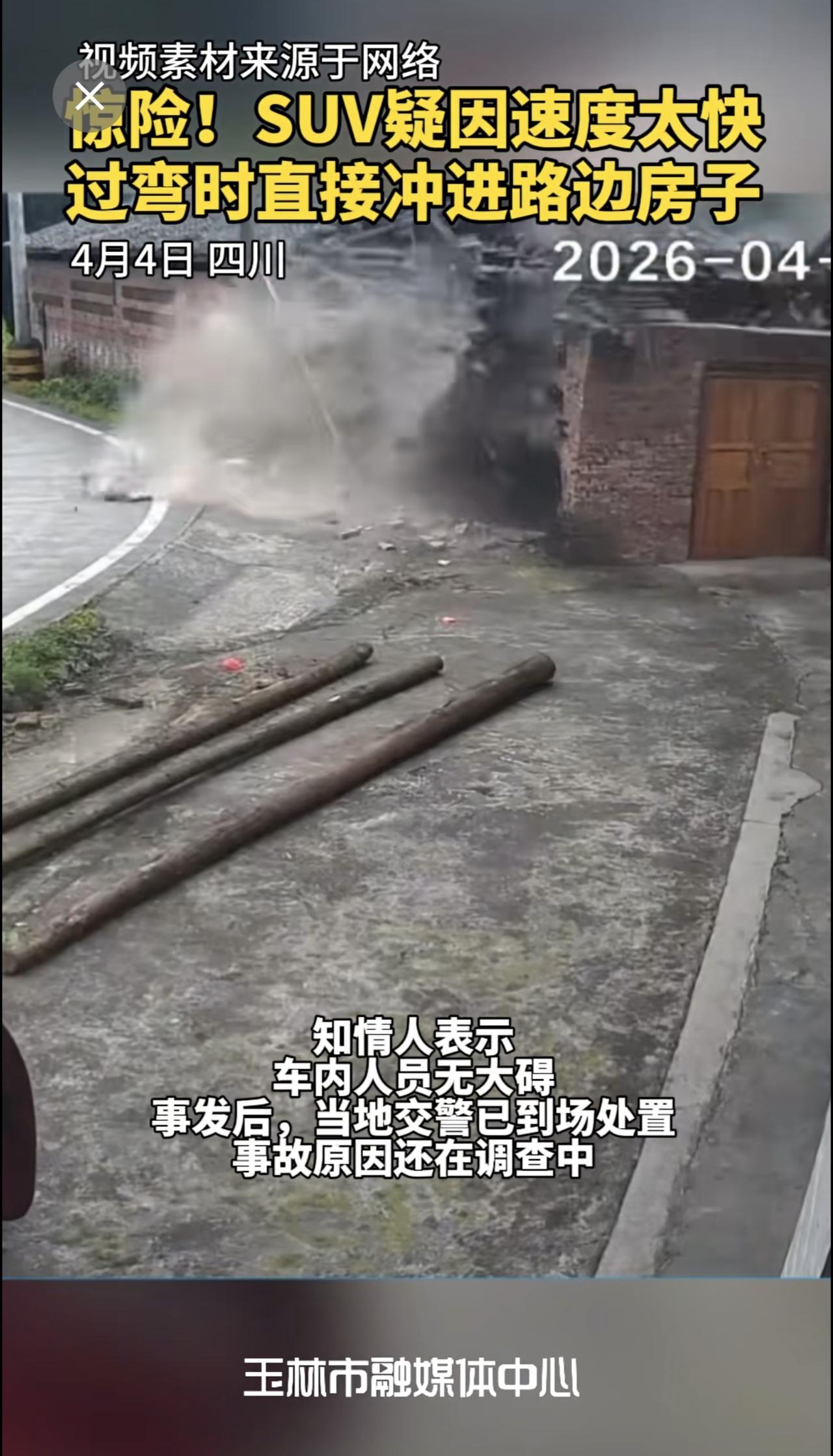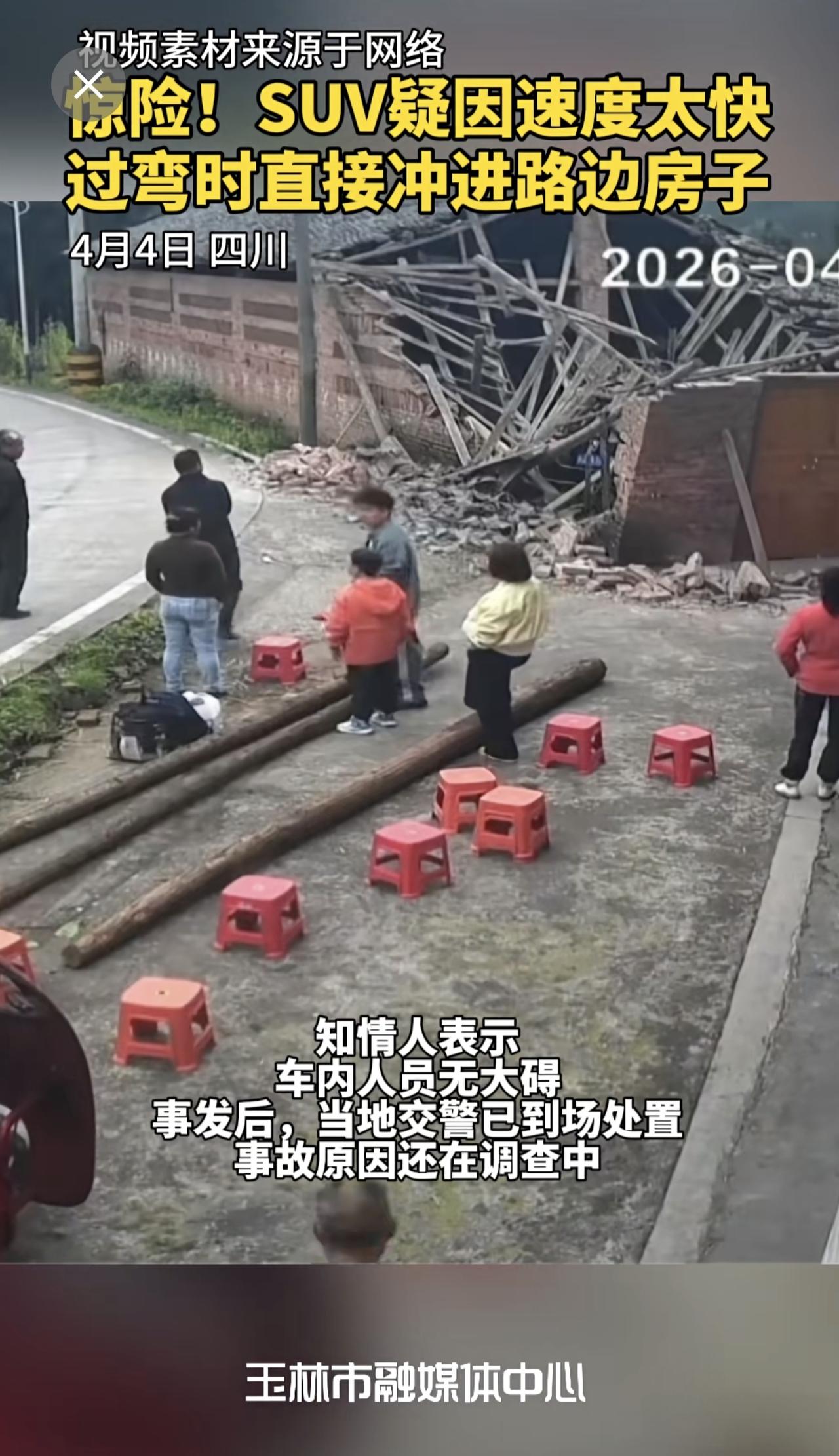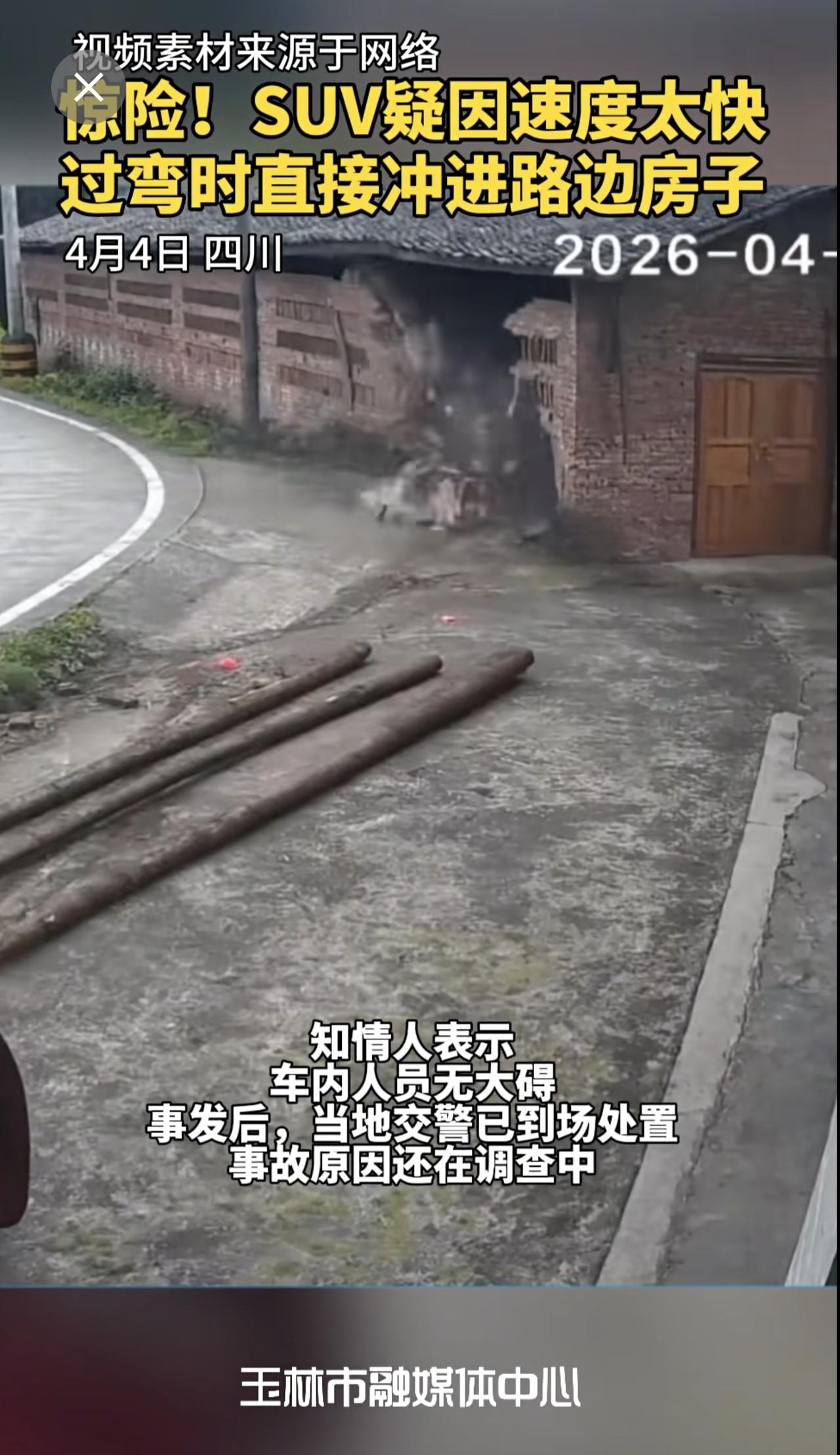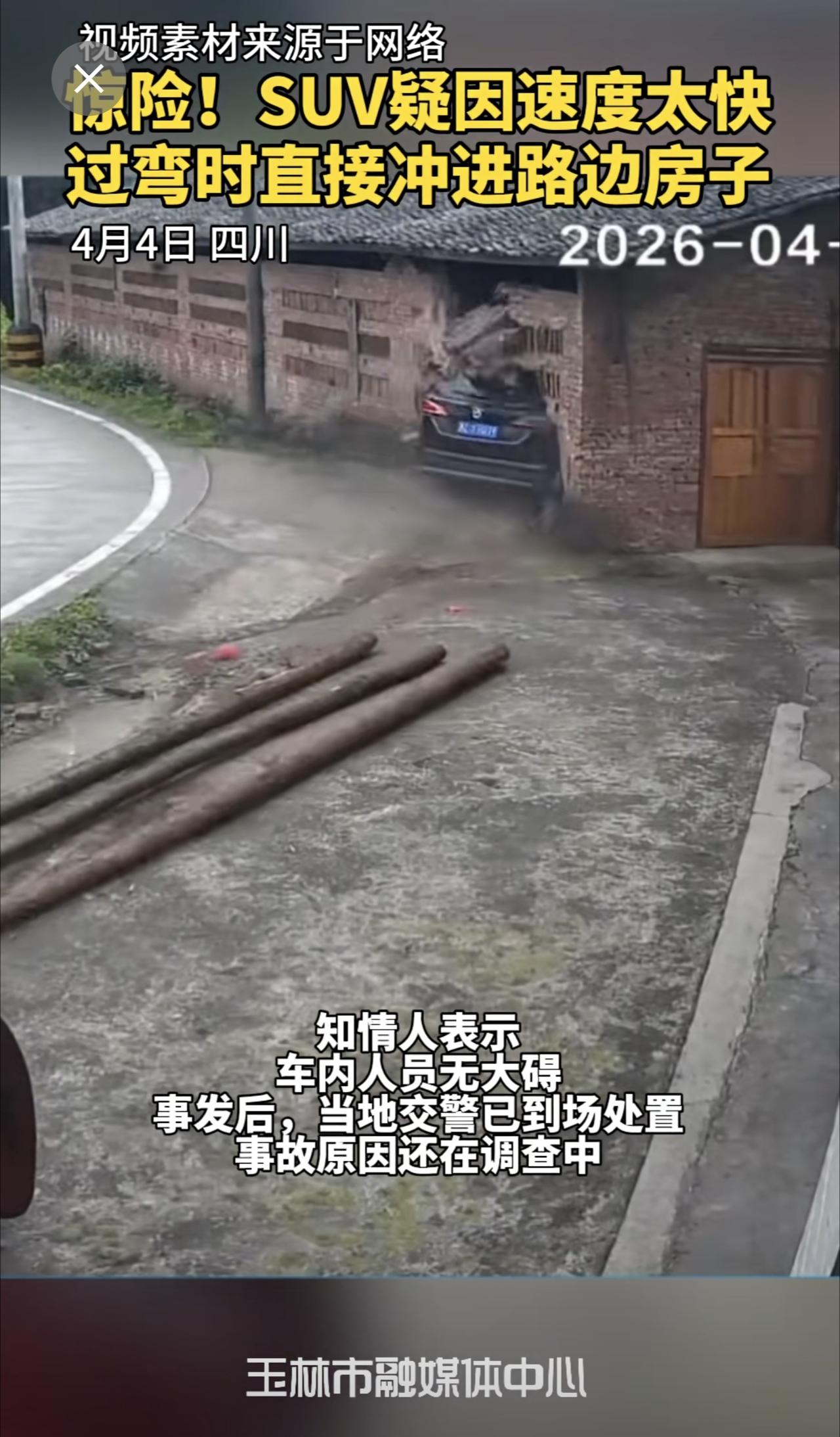 惊险!SUV疑因速度太快,过弯时直接冲进路边房子,房子瞬间崩塌,万幸的是人没事。