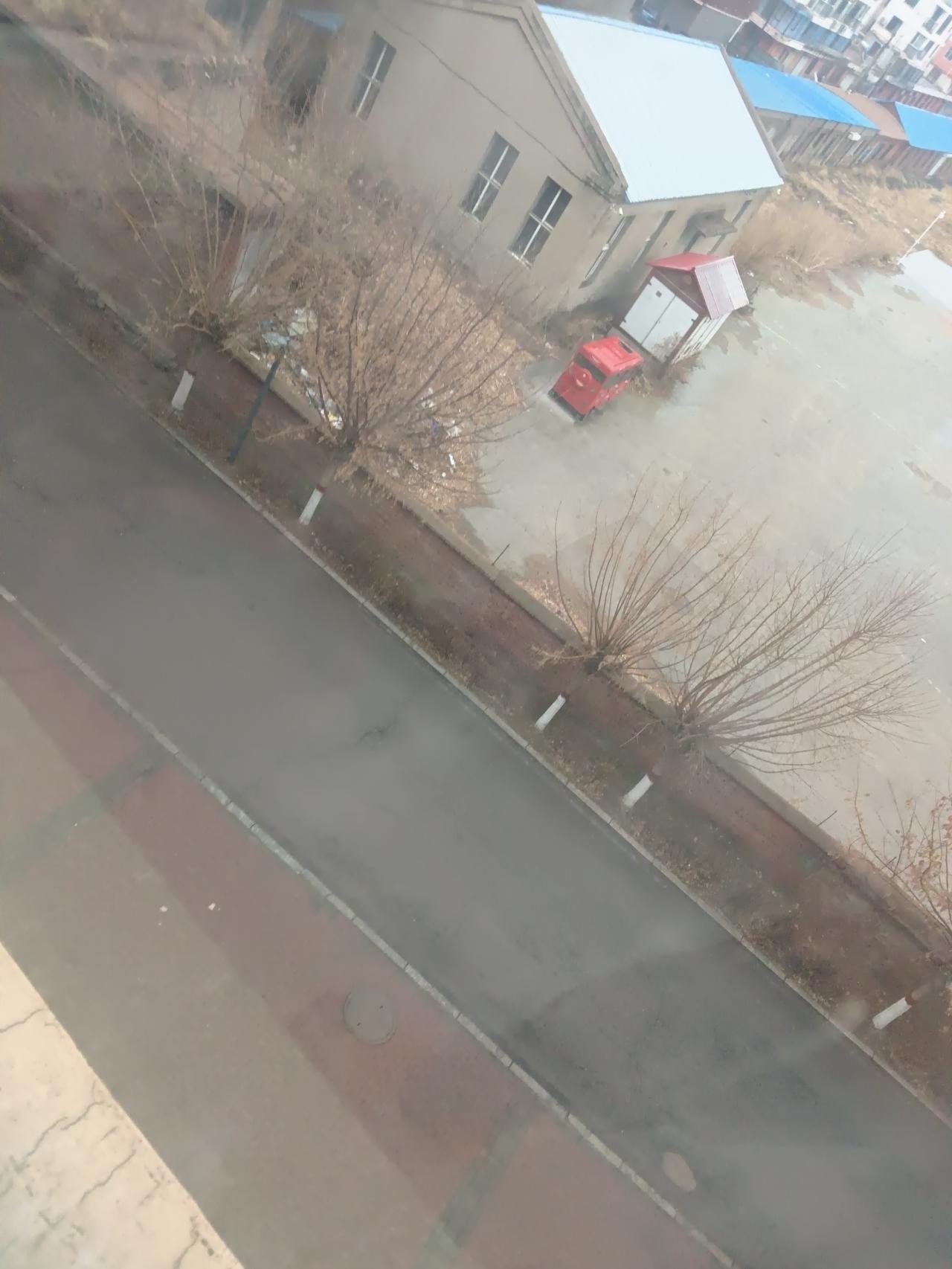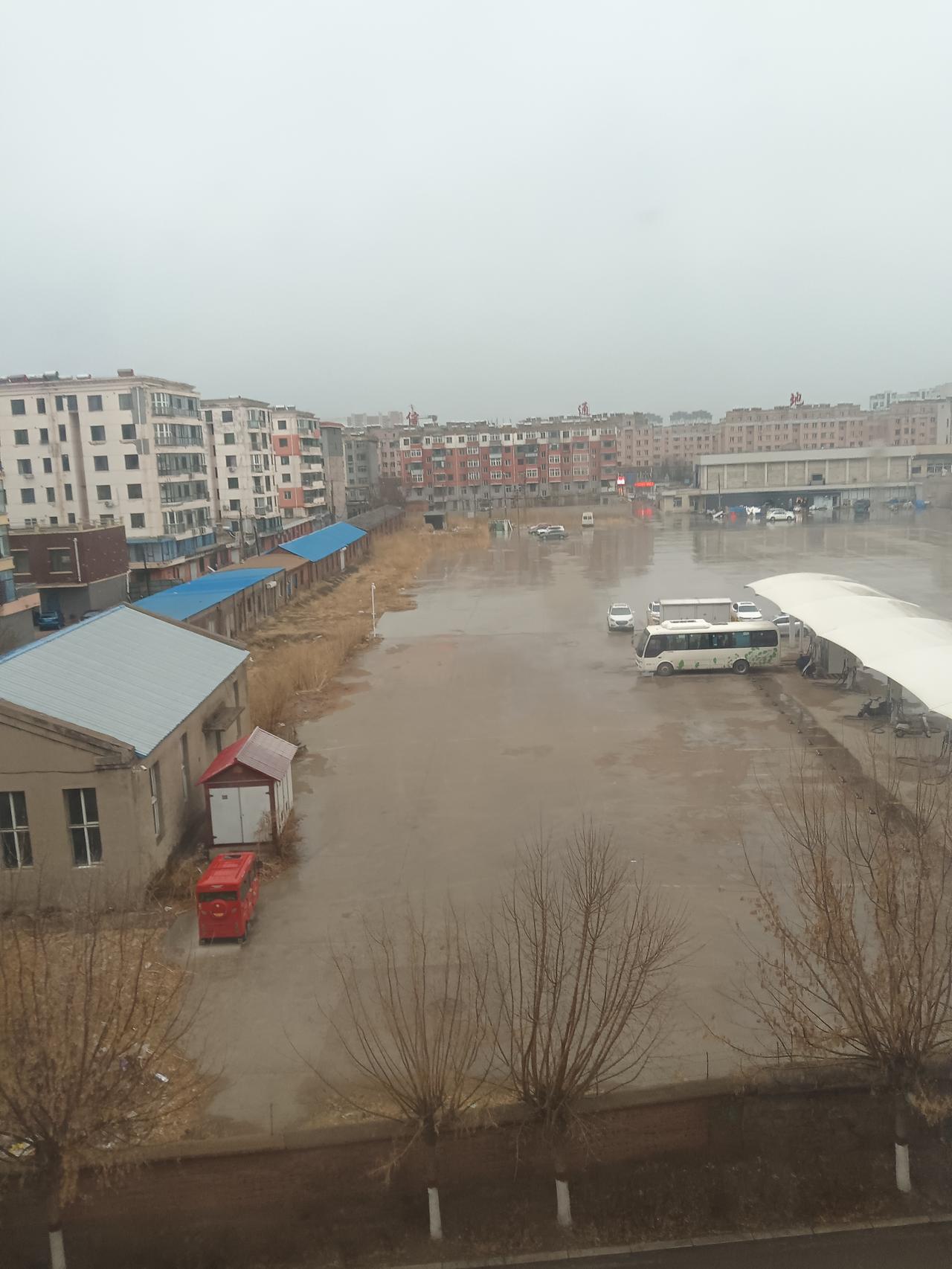 雨中城市一角,公交车停靠在雨棚下,静待归人。