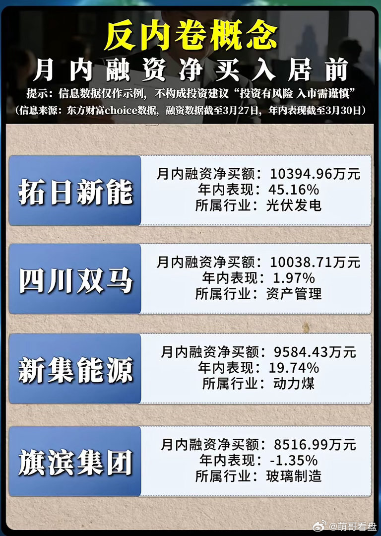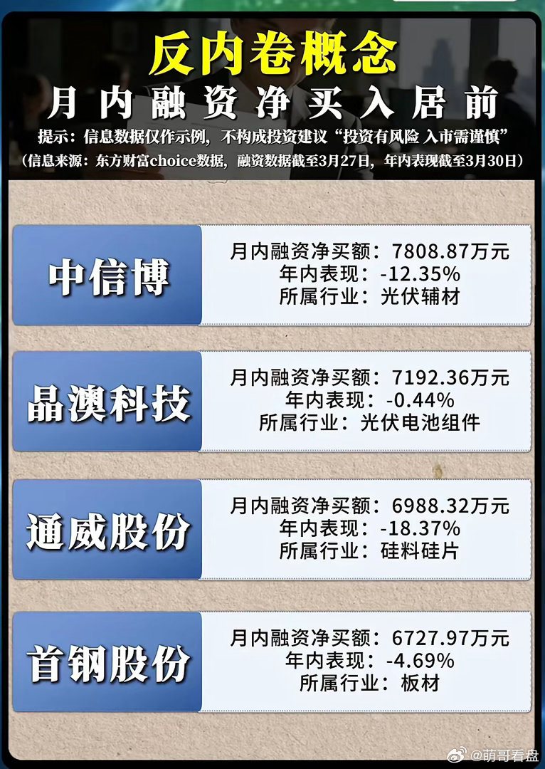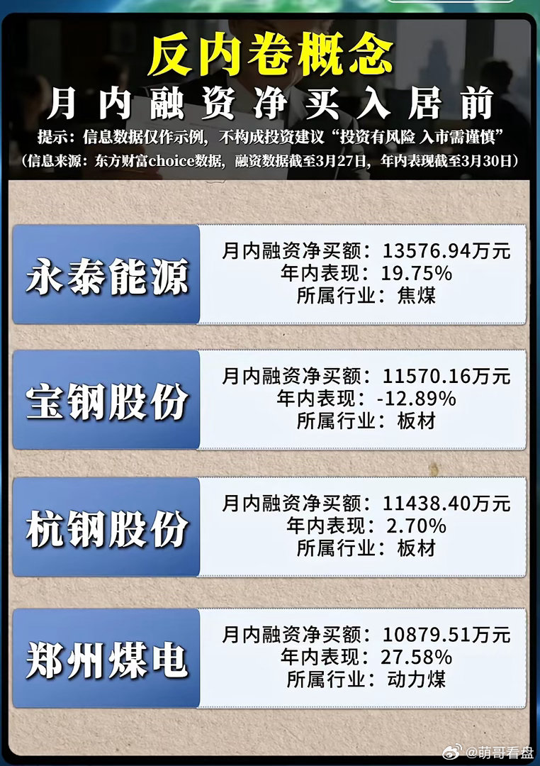 融资盘突然重仓“反内卷”赛道?这波布局到底藏着什么产业密码?当市场还在纠结传统赛道的增长天花板,融资资金却已悄然完成对“反内卷”核心标的的重兵布局。从煤炭到光伏,从钢铁到能源材料,3月融资净买入居前的个股名单里,没有虚无缥缈的概念,只有踩中政策红利与技术跃迁的硬核标的,而这背后,正是2026年产业转型的两大核心逻辑在发力。融资资金的精准押注,首先锚定了煤炭行业的周期反转与资源价值重估。3月潞安系豪掷超百亿元拿下山西煤炭探矿权,两宗核心地块溢价超千倍,能源巨头百亿扫货的背后,是行业供给端的持续收紧与需求端的爆发式增长。数据显示,3月动力煤价格打破淡季规律,环渤海港口5500大卡动力煤平仓价从710元/吨涨至758元/吨,月涨幅超5%;焦煤更是受钢厂复产提速驱动,主焦煤月内涨幅超120元/吨。与此同时,国际油气价格高企触发“气转煤”替代效应,叠加大秦线检修预期下的终端提前备货,煤炭板块正迎来“短周期涨价+长周期能源安全保障”的双重红利。正如融资资金对郑州煤电、新集能源的重仓逻辑,传统能源的“压舱石”价值,在能源格局动荡的当下正被重新审视。而光伏赛道的爆发,则源于政策松绑与技术突破的双重共振,这也正是晶科能源、拓日新能获融资资金青睐的核心原因。3月国家能源局重磅新政落地,取消分布式光伏“变压器容量80%”硬性限制,改为绿、黄、红三色分区管理,审批时限从30天压缩至15天,直接释放超550GW潜在装机空间。技术层面,N型TOPCon电池量产效率突破26%,中科院铜锌锡硫硒电池效率再破世界纪录,高效技术替代进程加速。更关键的是,工信部强制组件效率标准落地,PERC组件效率不低于24.2%、TOPCon不低于25%,行业彻底告别低价内卷,优质产能迎来利润修复窗口。融资资金重仓晶科能源(年内表现25.53%)、拓日新能(年内表现45.16%),正是押注行业从“规模扩张”向“质量突围”转型后的增长红利。反观钢铁、板材板块,融资资金的布局则紧扣产能压减与行业洗牌的主线。3月发改委明确2026年有序压减钢铁产能,全年粗钢产量预计降至9.3亿吨,同比减少约2000万吨,同时推行产能置换差异化比例要求,信贷资源向优质产能倾斜,落后产能面临金融断流、成本高企的双重压力。在这一背景下,宝钢股份、杭钢股份、华菱钢铁等头部板材企业,凭借规模优势与技术壁垒,成为行业出清的最大受益者。融资资金逆势布局这些标的,正是看好供给收缩下行业盈利水平的持续改善,以及龙头企业定价权的回归。从融资盘的重仓方向不难看出,当前市场的核心投资逻辑,早已脱离了“盲目扩张”的内卷陷阱,转向了“政策护航+技术驱动+供需重构”的高质量赛道。无论是煤炭的资源稀缺性、光伏的技术迭代红利,还是钢铁的产能出清机遇,都是产业转型下的确定性机会。而融资资金的集中布局,恰恰印证了这些方向的投资价值——在不确定的市场中,唯有踩准政策与技术的双重节拍,才能在“反内卷”的产业浪潮中,抓住真正的增长机遇。