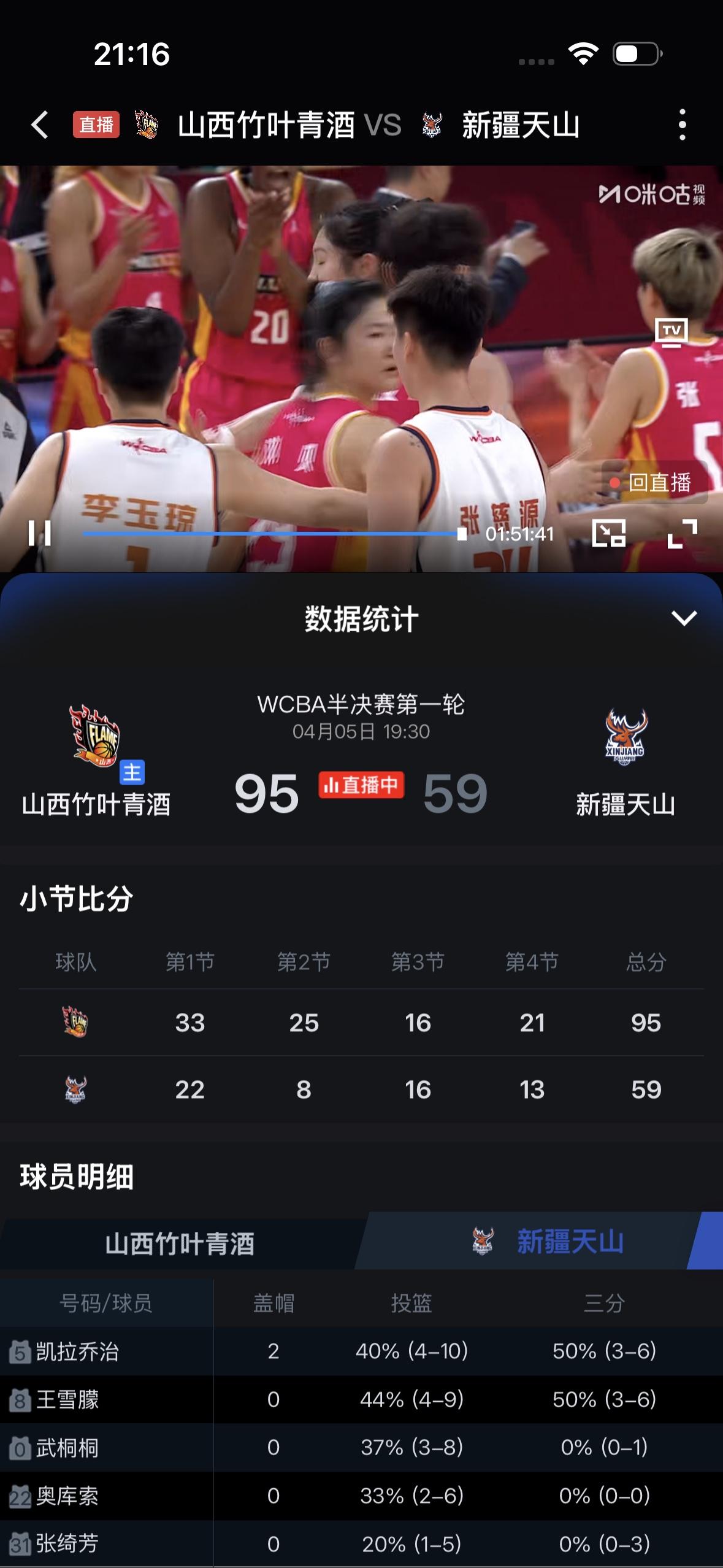 最终新疆天山女篮在争夺决赛权的第一场比赛中大比分输了! 在刚刚结束的新疆天山女篮客场挑战山西竹叶青酒女篮的比赛中,新疆天山女篮最终以59比95输了! 纵观全场比赛,新疆天山女篮实力明显低于山西队,而且防守不行,王雪朦、武桐桐、乔治表现出色。反观山西竹叶青酒女篮,内线优势明显,拼抢积极,打球人多,外援表现出色。 新疆天山女篮的丫头子们!争取下场回到主场好好的打吧!