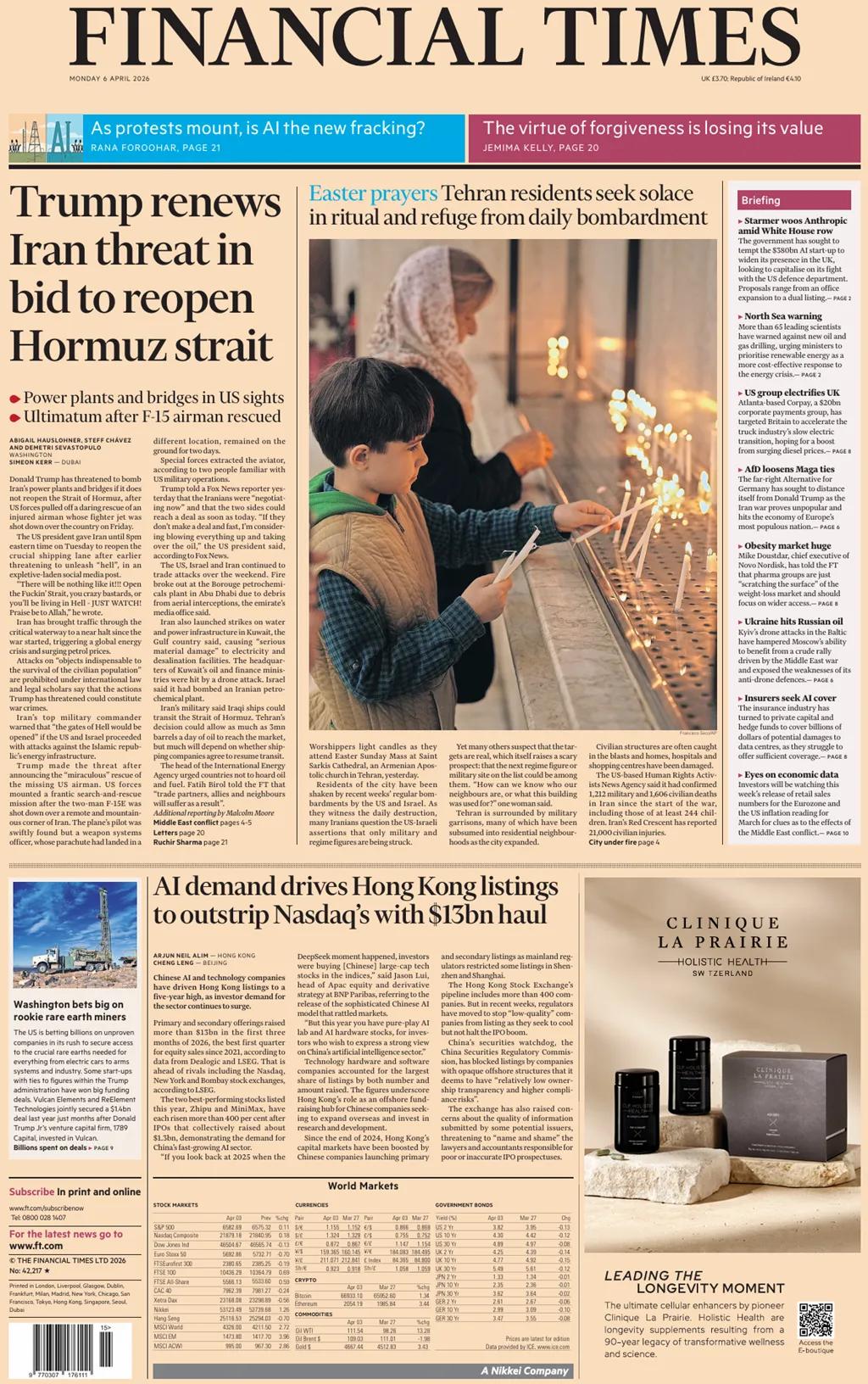 《金融时报》头版报道,华盛顿在“新手”稀土矿商身上下重注 。美国在急于确保获得从电动汽车到武器系统及工业所需的关键稀土的过程中,在未经证实的公司身上押注数十亿美元。 一些与特朗普政府内部人士有关联的初创企业赢得了巨额融资交易。Vulcan Elements和ReElement Technologies去年共同获得了一笔140亿美元的交易,就在小唐纳德·特朗普的风险投资公司1789 Capital投资Vulcan仅仅几个月之后。 数十亿美元花在交易上 另外该报关注了,人工智能需求推动香港上市募资超130亿美元,超过美国纳斯达克。 中国人工智能和科技公司推动香港上市数量达到五年高位,投资者对该领域的需求持续飙升。 法国巴黎银行亚太股票及衍生品策略主管刘杰森表示:“当DeepSeek发布时,投资者就在买入指数中的(中国)大型科技股。”他指的是那家震动市场的先进中国人工智能模型的发布。 由于内地监管机构“限制”了深圳和上海的一些上市活动,(公司选择在香港进行)首次公开募股(IPO)和二次上市。 根据迪罗基公司(Dealogic)和路孚特公司(LSEG)的数据,在2026年的前三个月,首次公开募股和二次上市共筹集了超过130亿美元,这是自2021年以来股权销售最好的第一季度。 据路孚特公司称,这超过了包括纳斯达克、纽约证券交易所和孟买证券交易所在内的竞争对手。 香港证券交易所排队等待上市的公司超过400家。 但最近几周,监管机构采取行动阻止“低质量”公司上市,他们试图给IPO热潮降温而非叫停。 “但今年出现了纯人工智能实验室和人工智能硬件股票,适合那些希望对中国人工智能领域表达强烈看好的投资者。” 科技硬件和软件公司在上市数量和募资额方面都占了最大份额。这些数据凸显了香港作为中国公司寻求海外扩张及投资研发的离岸融资中心的作用。 中国证券监管机构中国证券监督管理委员会已阻止那些拥有不透明离岸架构、被认为“股权透明度相对较低且合规风险较高”的公司上市。 今年上市表现最佳的两只股票,智谱和迷你Max,在首次公开募股后股价均上涨超过400%,它们总共筹集了约13亿美元,显示出对中国快速发展的人工智能领域的需求。 自2024年底以来,中国公司在香港进行首次公开募股推动了香港资本市场的发展。 香港证券交易所还对一些潜在发行人提交的信息质量表示担忧,要“点名批评”那些对糟糕或不准确的IPO招股说明书负有责任的律师和会计师。