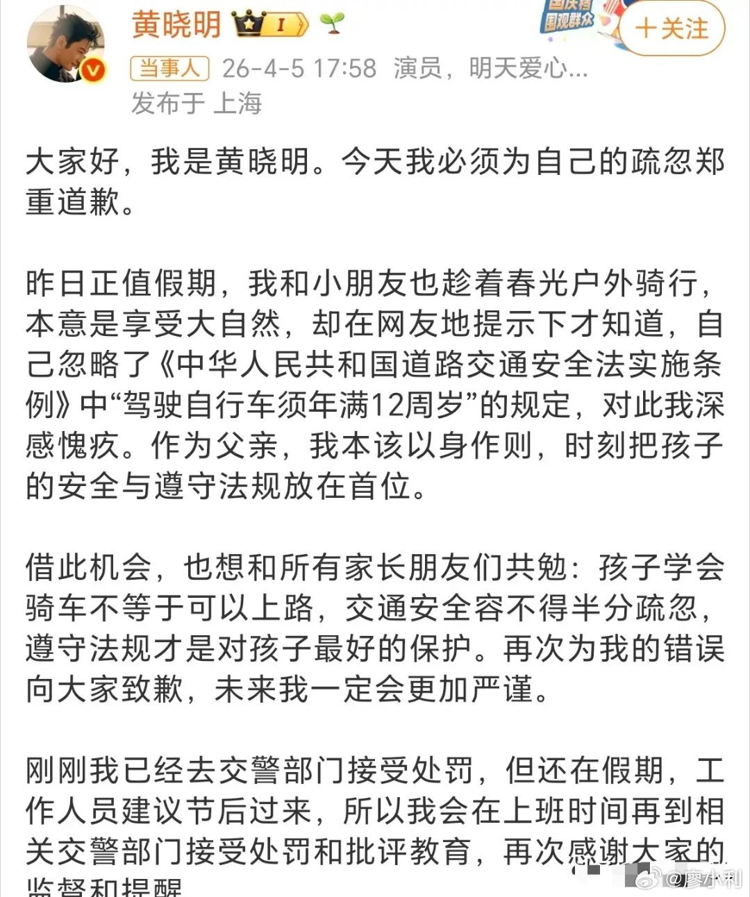 黄晓明就带娃骑行道歉对普通人来说,这件事可能根本不算回事,可他是公众人物,哪怕一件很小的事都有可能会产生巨大的辐射效应。所以黄晓明这事处理得聪明,带娃骑车疏忽违规,被网友指出后立马诚恳道歉,还主动找交警说明情况,不甩锅不辩解,态度端正有担当,给大家也提了个安全醒。小利说事