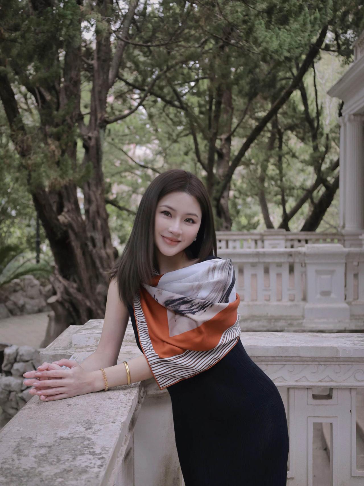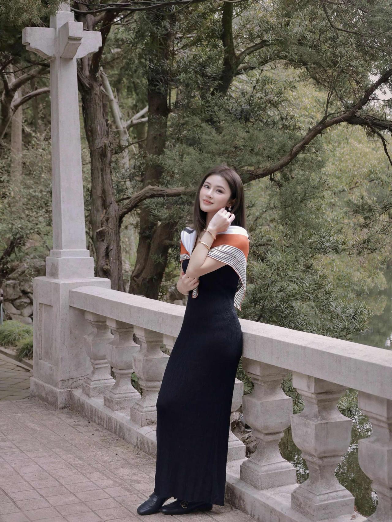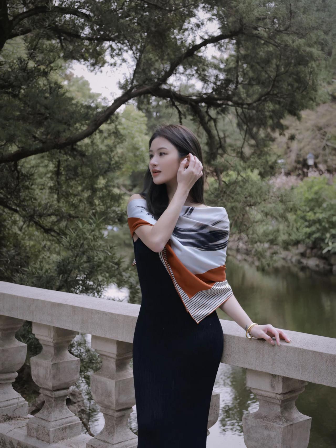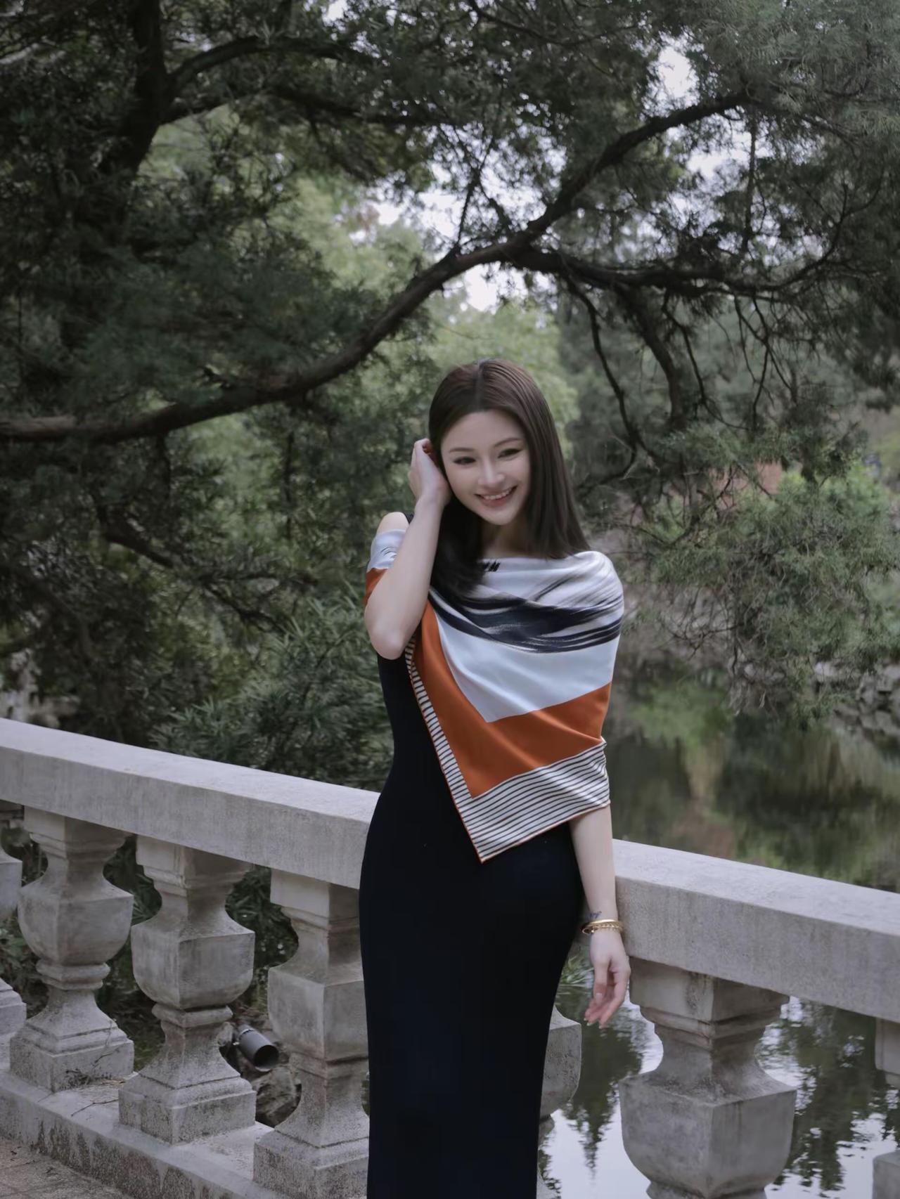 🧣 优雅知性风丝巾造型 这套造型以黑色针织连衣裙+撞色丝巾为核心,打造出兼具复古韵味与都市高级感的优雅知性风格,适配多种轻正式场合。 ✨ 核心单品拆解 1. 黑色无袖针织连衣裙 • 版型与面料:修身坑条针织面料,贴合身形勾勒曲线,无袖设计露出肩颈线条,长度及地,垂坠感强,自带优雅质感。 • 风格适配:黑色是经典的“万能底色”,既能衬托丝巾的色彩,又能凸显沉稳知性的气质,是打造优雅风的基础款。 2. 撞色丝巾(造型核心) • 设计细节:采用白+焦糖橙+藏蓝的撞色设计,中心是抽象笔触图案,边缘搭配细条纹,配色复古高级,自带法式优雅氛围。 • 系法与效果:以斜角披搭的方式系在肩颈处,既起到了装饰作用,也巧妙修饰了肩颈线条,打破了黑色连衣裙的单调感,成为造型的视觉焦点。 3. 配饰点睛 • 金色手镯+珍珠耳钉:简约的金色手镯和珍珠耳钉,与丝巾的暖色调呼应,提升了整体造型的精致度,又不会过于张扬,完美契合知性优雅的调性。 • 黑色乐福鞋:低跟乐福鞋舒适百搭,与黑色连衣裙形成同色系呼应,弱化了高跟鞋的正式感,让整体造型更显松弛自然。 🌟 风格亮点 1. 一衣多穿,丝巾的妙用:用丝巾给基础款黑色连衣裙做加法,是打造“知性高级感”的经典思路,既提升了造型的层次感,也能轻松应对早晚温差。 2. 配色高级,氛围感拉满:焦糖橙+白+藏蓝的配色,自带复古滤镜,与公园的绿植背景适配度极高,拍出来的照片自带电影感。 3. 适配场景广泛:这套造型既能应对日常通勤、轻商务场合,也适合下午茶、公园漫步等休闲场景,优雅又不刻板。 💡 丝巾搭配延伸玩法 • 职场通勤风:将丝巾折成长条系在颈间,搭配西装外套,打造干练知性的职场造型。 • 法式复古风:将丝巾系在手腕或包袋上,作为小面积点缀,搭配衬衫或针织衫,营造慵懒的法式氛围。 • 度假休闲风:将丝巾系在头上作为发带,搭配连衣裙或牛仔裤,打造浪漫的度假造型。 📸 场景适配 • 公园/园林:与复古园林、绿植背景适配度极高,丝巾的暖色调在自然光影下氛围感拉满。 • 咖啡馆/下午茶:优雅知性的风格与轻社交场合完美契合,低调又不失质感。 • 日常通勤:得体大方,既能凸显气质,又不会过于夸张,适配办公室、会议等多种场合。 丝巾 婀娜多姿连衣裙