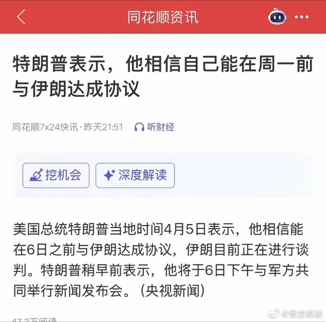 局势又要反转了?两个重磅消息暗示接下来可能又有缓和预期:今天A股因为清明假期会继续休市,但是今晚美股市场会正常交易;不出意外的话,美股开盘之前川普可能还会释放一些缓和利好来画K线;在周末各大金融市场都休市的情况下,能够看到美伊局势各种升级紧张的不利消息;但随着股市快要开盘了,又开始释放利好缓和气氛了,依旧是熟悉的套路;