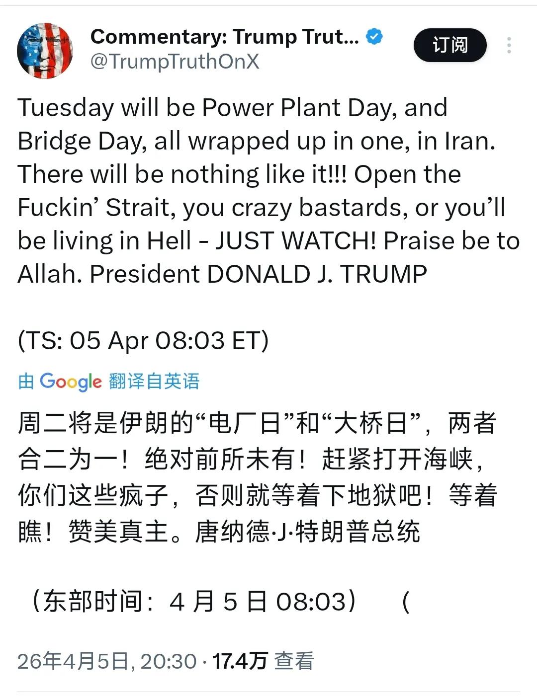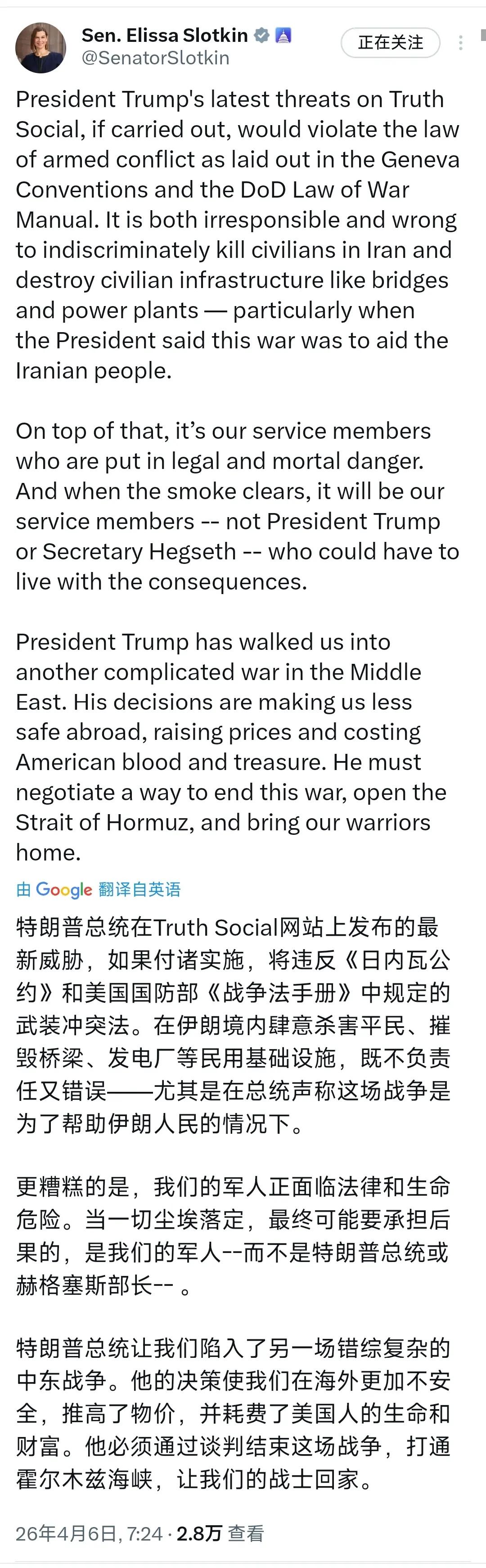 美国《新闻周刊》今天(4月6日)写道:“美国宪法第二十五修正案允许副总统和内阁多数成员宣布总统无法履行其职务。” 特朗普昨晚发表轰炸伊朗电场、大桥等民用基础设施的恐怖主义言论后(图4),在美国国内引发一片哗然,众多民主党议员发声谴责,认为特朗普的恐怖言论与美国所谓“世界文明灯塔”的形象背道而驰。《新闻周刊》更是怀疑特朗普的神经出了问题,提议由副总统万斯马上宣布履行总统职责。