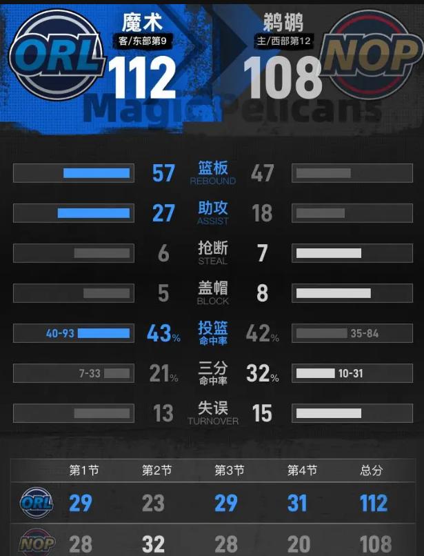 凌晨七点的球,本该是"菜鸡互啄",结果看出了人生百味。 鹈鹕这支队,就像你那个天天喊"天赋异禀"的室友——萨迪克-贝32分亮瞎眼,锡安冲起来跟坦克似的,米西18分13板还盖了4个火锅,数据表豪华得跟别墅似的。可你看最后一节,领先15分到被翻盘,跟看恐怖片一个德行:明知道要出事,还是忍不住捂眼睛。费尔斯关键三罚砸了两,这就是把"交学费"仨字刻脑门上了。8连败?不冤。这叫"摆烂后遗症"并发症,病根儿在骨子里——天赋能帮你考高分,但不能帮你写完最后的大题。 魔术这边?班凯罗23分16板,14中6的效率是糙了点,但15个罚球跟钢板似的往上凿;贝恩末节13分,四罚全中,手硬得跟冰块一样。全队三分33中7,铁得能把篮筐砸歪,可人家抢了57个篮板,硬是靠"二次进攻"把鹈鹕磨死了。这赢法是真丑,丑得跟半夜抢外卖似的——但抢到了,就是本事。 说到底,鹈鹕缺的不是天赋,是"怎么把比赛打完"的那根筋。魔术胜在知道"丑赢"也是赢。生活就这样:天赋能让你领先15分,但只有韧性,才能让你在终场哨响时,还站在赢的那一边。魔术连续四季横扫鹈鹕,9连胜不是运气,是"我铁但我能防,我丑但我能赢"的生存哲学。这剂药方,鹈鹕得好好接着。鹈鹕不敌魔术8连败