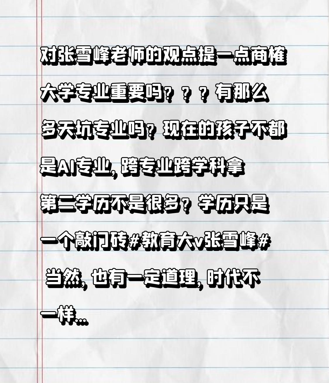 对张雪峰老师的观点提一点商榷[祈祷] 大学专业重要吗??? 有那么多天坑专业吗? 现在的孩子不都是AI专业, 跨专业跨学科拿第二学历不是很多? 学历只是一个敲门砖教育大v张雪峰 当然, 也有一定道理, 时代不一样。 本科学历了就可以考公考编, 好多不限专业, 我觉得学校更重要, 代表更高的平台, 进去后还可以换专业, 氛围就不一样[祈祷]
