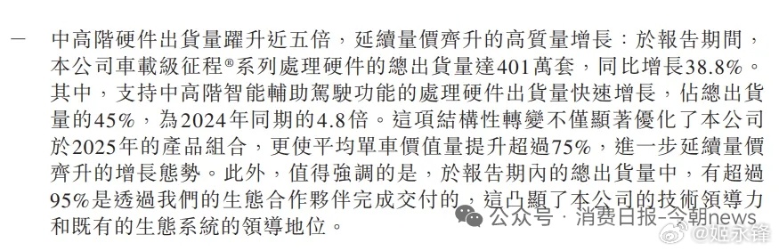 在其自主研发的征程®系列车载芯片2025年总出货量达401万套的背景下,地平线在自主品牌ADAS市场以47.7%份额稳居第一,20万元以内主流车型中高阶智驾方案市占率达44.2%,位列行业首位。