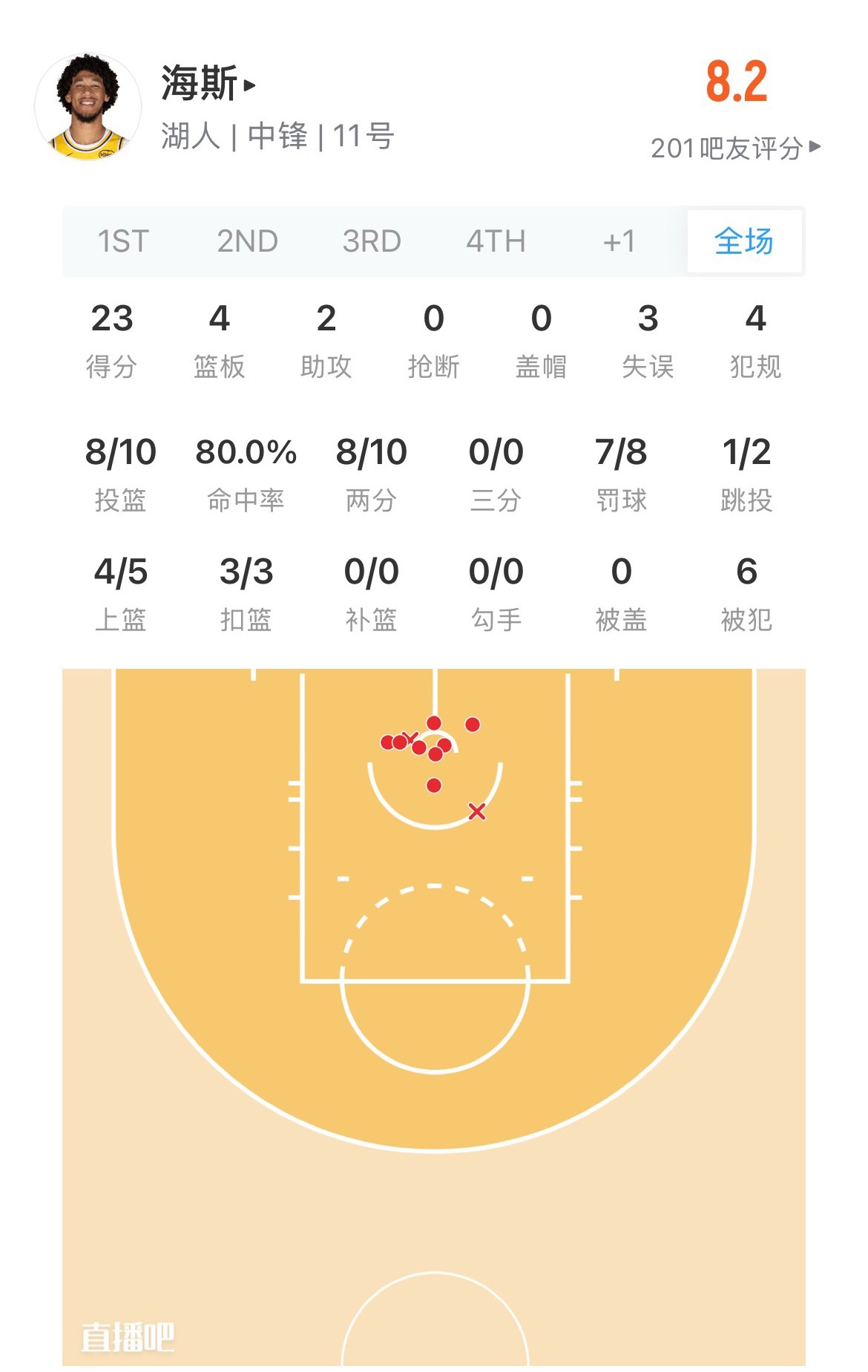 海斯本场比赛得到23分4板2助,得分湖人生涯新高