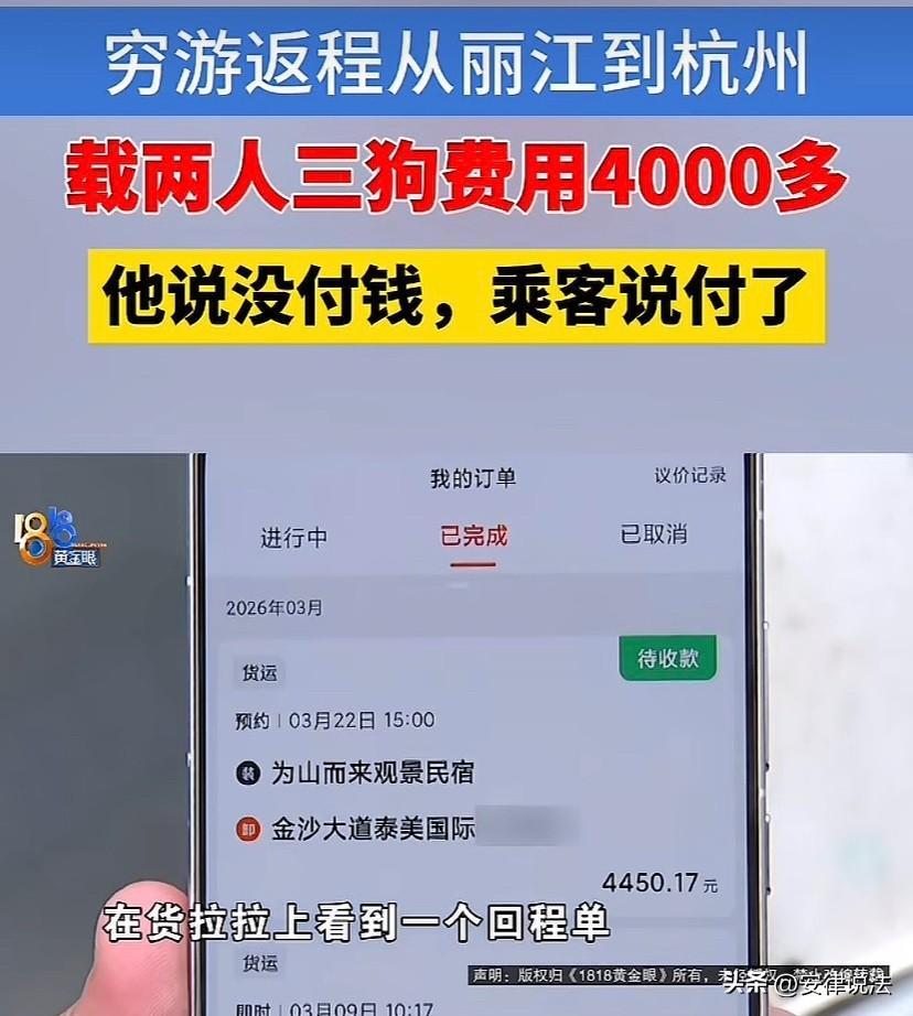 “玩脱了?”浙江杭州,薛先生开着面包车穷游西藏,返回途中为了平摊成本顺道接了个货拉拉订单,拉上朱、张2名女士以及她们的3条狗、一些行李。 到约定地点,薛先生见到了朱女士、张女士和她们的三条大狗,还有一堆行李。面包车本就不大,瞬间被塞得满满当当,气味很难闻。薛先生不怎么喜欢狗,也怕长途路上狗乱拉乱掉毛,但舍不得运费,还是硬着头皮开了车。 出发前,几人加了微信,张女士拍着胸脯保证,送到后运费一分不少。薛先生见她实在,就放下心专心开车。 这2505公里,薛先生开了两天两夜,只在服务区短暂休息。车厢气味越来越重,狗时不时叫,两位女士还总提要求,他全程精神紧绷,好几次想抱怨都忍了下来。 到了杭州,薛先生把车停在约定地点,张女士拿出手机给他看转账截图,显示4450.17元已转,还说平台会半小时内自动到账。薛先生看金额对,就让她们下了车。 可薛先生回到车里查货拉拉和手机银行,余额压根没变化。他联系张女士,发现被微信拒收、电话打不通,再看截图,才发现是P的,原图是一笔32元的小订单。 第二天,薛先生去银行打了流水,上面没有这笔运费记录。他拿着流水和截图找货拉拉投诉,客服确认截图是伪造的,平台也没有支付记录。 薛先生不甘心,联系了当地媒体。记者找到朱、张两位女士,朱女士喊冤,说她和张女士结伴旅行,约定交通费由张女士负责,她一直以为运费已经付了。 张女士一开始嘴硬,说自己付了钱是薛先生讹人,可面对银行流水和平台记录,她最终承认,截图是P的,就是想赖掉运费。 这事传到网上,网友都骂张女士离谱,有钱养狗旅行,却赖司机辛苦钱,还有人扒出她的社交账号,打卡照和赖账模样反差很大。 货拉拉很快给薛先生垫付了运费,还起诉了张女士,称会追究她的法律责任。警方也介入调查,调取了行车记录仪等证据,确认张女士恶意逃单。面对确凿证据,张女士的狡辩没用,目前案件还在处理中。 其实这事里,薛先生也有问题,他的面包车是非营运的,货拉拉接单本身不合规,道路交通安全法禁止货用机动车载客,查到会罚款扣车,出事故保险公司还可能拒赔。 朱、张两位女士带三条狗坐货拉拉也不安全,面包车本是载货的,没有安全设施,狗也不受控,容易出危险。货拉拉平台审核太松,也有不可推卸的责任。 薛先生拿到了运费,也吸取了教训;朱女士和张女士断了来往,还向薛先生道了歉;张女士则要面临法律制裁和网友指责,得不偿失。 这事虽小,却能看出人心,诚信才是为人之本,耍小聪明逃单,最终只会自食恶果,大家也得有法律意识,别为了小钱做违法失德的事。