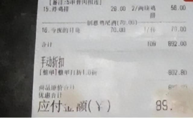 山西一女子请客吃烧烤消费892元,老板搞一折活动收她89.2元,结完账女子说刚刚