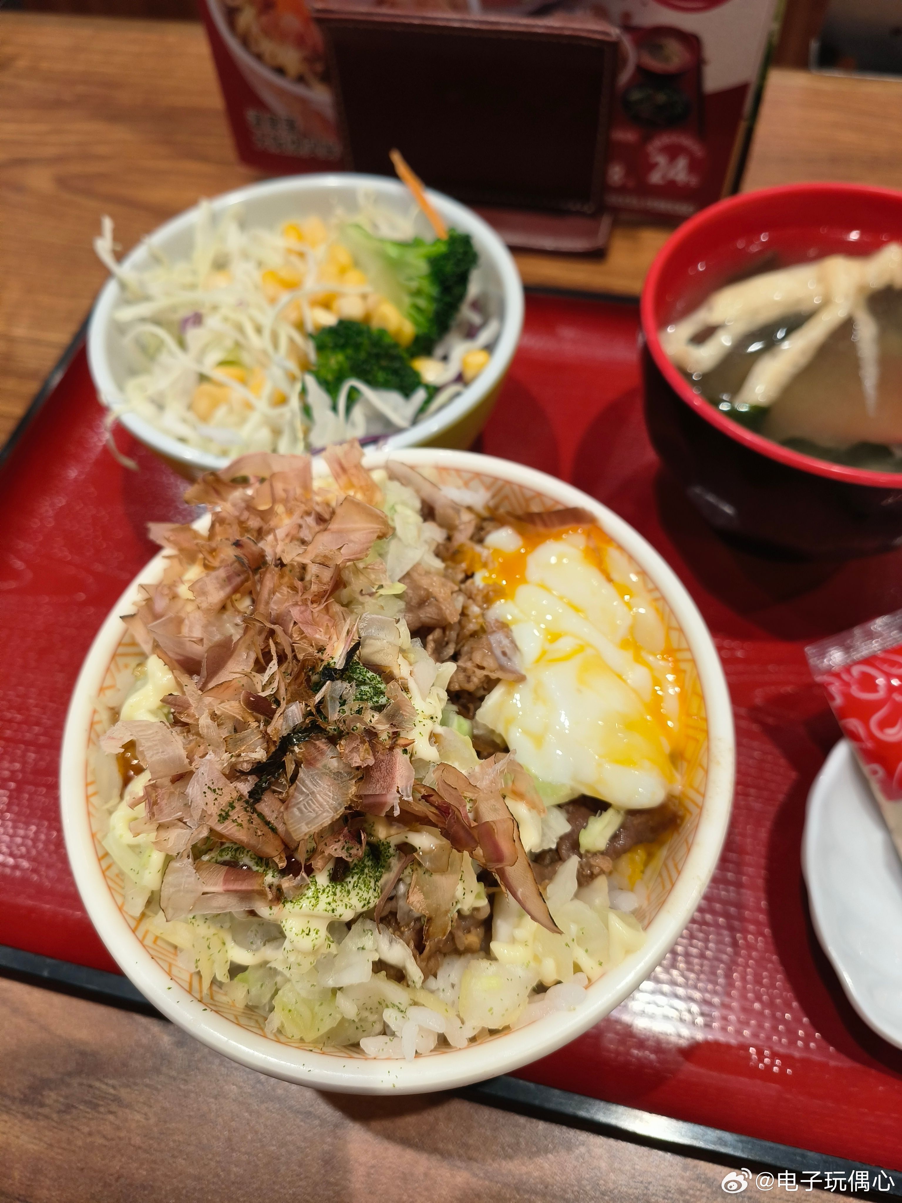 每次去食其家,我都会点一份蔬菜沙拉。蔬菜沙拉很朴素,生菜丝、玉米粒、小番茄,淋上芝麻酱。我喜欢先把沙拉拌匀,让每一片生菜都裹上酱汁,然后先吃几口——清脆的生菜配上香浓的芝麻酱,开胃又清爽。然后再跟牛肉饭交替着吃:一口牛肉饭的浓郁,一口沙拉的清爽,来回切换,怎么吃都不腻。