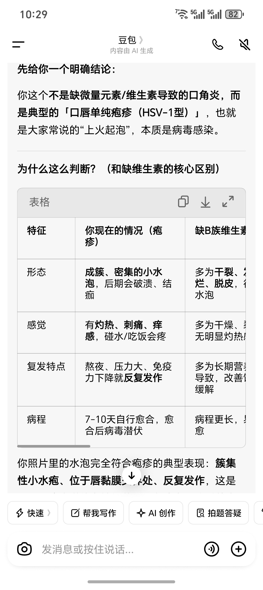 目前豆包这类AI助手对普通人还有一个非常好用的场景就是「日常身体诊断」根据你的症状 身体情况 甚至照片可以给到你一个像医生一样的初步诊断相比当年的百度靠谱得多