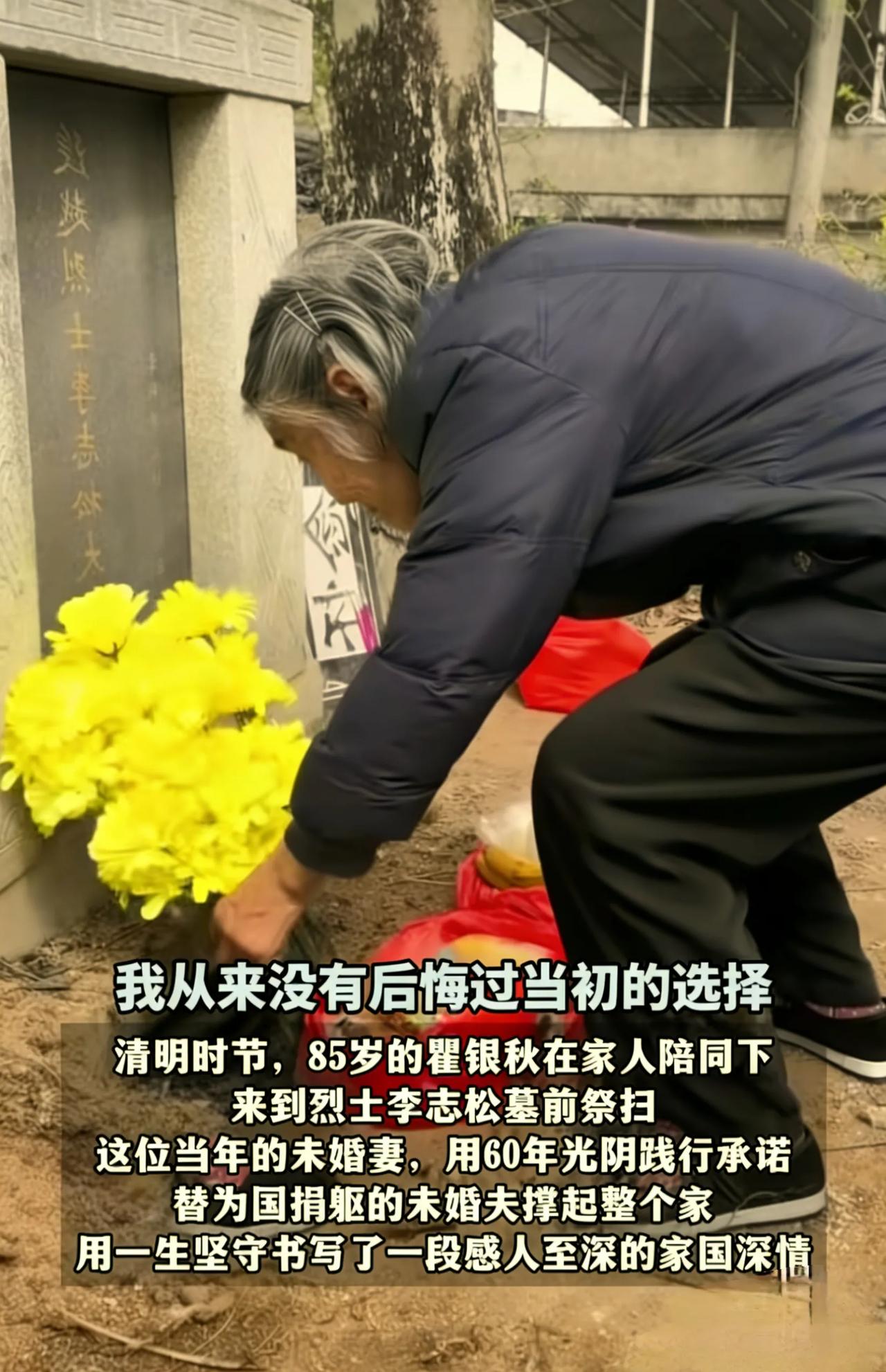 60年,她把“未过门媳妇”,活成了李家最亲的人 在这个快餐时代,我们好像习惯了“算了”、“没事”、“下次吧”。承诺似乎变得越来越轻,越来越不值钱。但今天这个故事,却像一记重锤,狠狠敲在我们心上,让我们重新理解了什么叫“一诺千金”。 故事的主角,是一位叫瞿银秋的老人,和一位叫李志松的年轻英雄。 1966年,24岁的李志松报名参军,奔赴前线。临走前,他握着未婚妻瞿银秋的手,许下了一个最朴素的愿望:“等我回来,咱们就结婚。”瞿银秋含泪点头,把满心的欢喜与期盼,都缝进了那双连夜赶制的布鞋里。 她以为,这只是一次短暂的分别。她以为,他们很快就能过上柴米油盐的小日子。 然而,战争是残酷的。1966年12月22日,李志松在执行任务时,不幸触雷牺牲,将24岁的生命永远留在了异国他乡。 噩耗传来,整个家都塌了。李志松是家里的顶梁柱,下面还有年幼的弟妹,父母悲痛欲绝,几乎垮了。20岁的瞿银秋,一夜之间,从待嫁的新娘,变成了痛失未婚夫的孤女。 村里的人都劝她:“你还年轻,长得也不差,别在这棵歪脖子树上吊死了,赶紧改嫁吧,别耽误自己一辈子。” 是啊,改嫁,对她来说是最好的选择。她有青春,有未来,为什么要为一个已经不在的人,搭上自己的一生? 但瞿银秋没有。她擦干眼泪,跪在了公婆面前,说出了那句让所有人泪崩的话: “爸、妈,志松走了,我就是你们的亲闺女。这个家,我来扛,我替他守着。” 没有一纸婚约,没有名分,她就这样,用自己的青春,扛起了这个支离破碎的家。 从那天起,她就成了家里的“男人”。天不亮就起床,下地干活、挣工分;晚上回家,洗衣做饭、端茶喂药。她要照顾卧病在床的公婆,要拉扯年幼的弟弟妹妹。那些年,她吃过的苦,恐怕我们现在的人很难想象。 寒冬腊月,山里雪没脚踝,她为了给公婆抓药,踩着冰雪翻山越岭,手脚冻得开裂出血也不喊疼。农忙时节,顶着烈日在田里干到天黑,回到家还要继续操持家务,常常累到倒头就睡。 有媒人踏破门槛,给她介绍条件优越的对象,都被她一一回绝。公婆心疼她,多次劝她改嫁,她总是摇摇头说:“我答应过志松,要照顾好这个家。他为国家丢了命,我替他守好家,是应该的,一点不委屈。” 为了能名正言顺地留在李家,她后来嫁给了李志松的弟弟。但她从未忘记自己的承诺,依旧悉心照料着公婆,直到他们百年归老。 60年,整整60年。从青丝到白发,从20岁的少女到80多岁的老人。她用一生,践行了一句诺言。她守的,不是一间空房子,而是爱人的根,是他的家国情怀,是他们之间那份跨越生死的深情。 每年清明,她都会带着家人去给李志松扫墓,轻轻擦拭墓碑,轻声念叨:“志松,家里一切都好,四世同堂了,你放心。” 这世上最动人的情话,从来不是“我爱你”,而是“我等你”、“我替你守着家”。这世上最珍贵的承诺,也不是一时的甜言蜜语,而是历经岁月沧桑,依然不改的初心。 瞿银秋老人用60年的坚守,告诉了我们什么是情义,什么是担当。她的故事,没有惊天动地的轰轰烈烈,却在日复一日的平凡中,写出了最动人的人间大爱。 看完这个故事,你还会轻易许下承诺吗?你还会觉得坚守很难吗?向英雄致敬,向这位用一生守护承诺的老人,致以最崇高的敬意。 60年守一家,这份一诺千金的深情,是不是戳中了你的泪点? 信息来源: 湖北日报、荆楚网