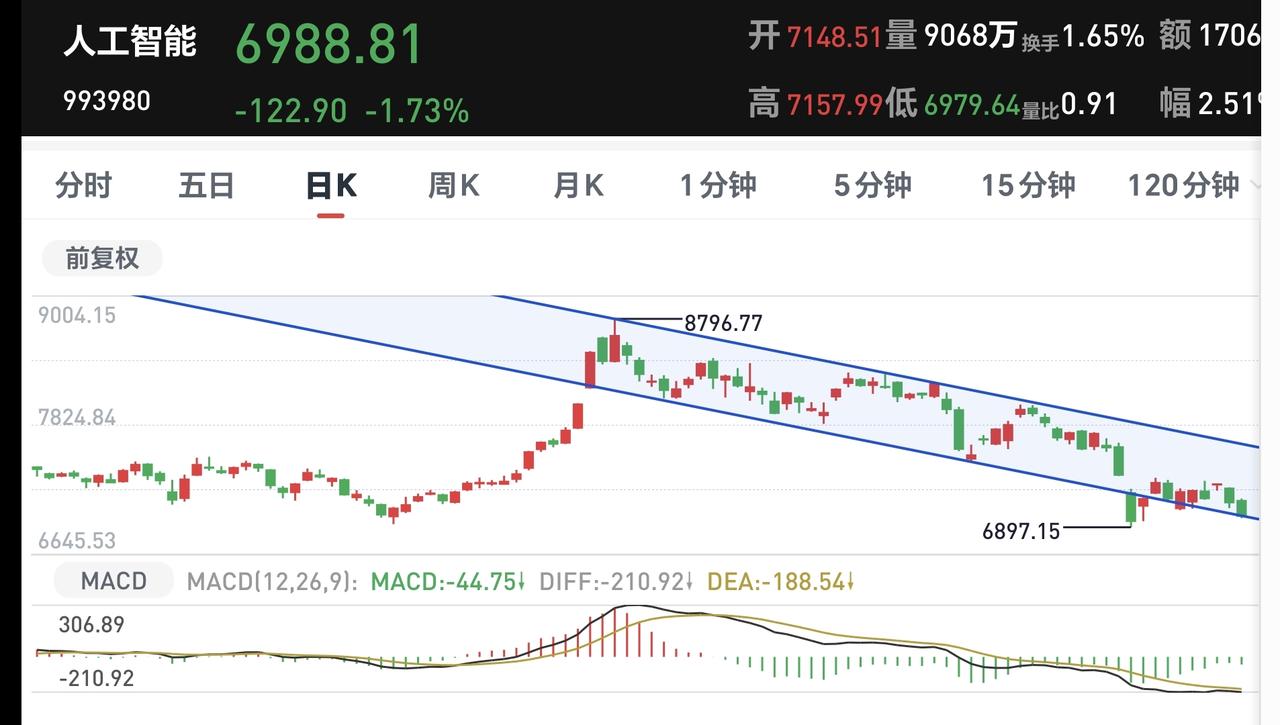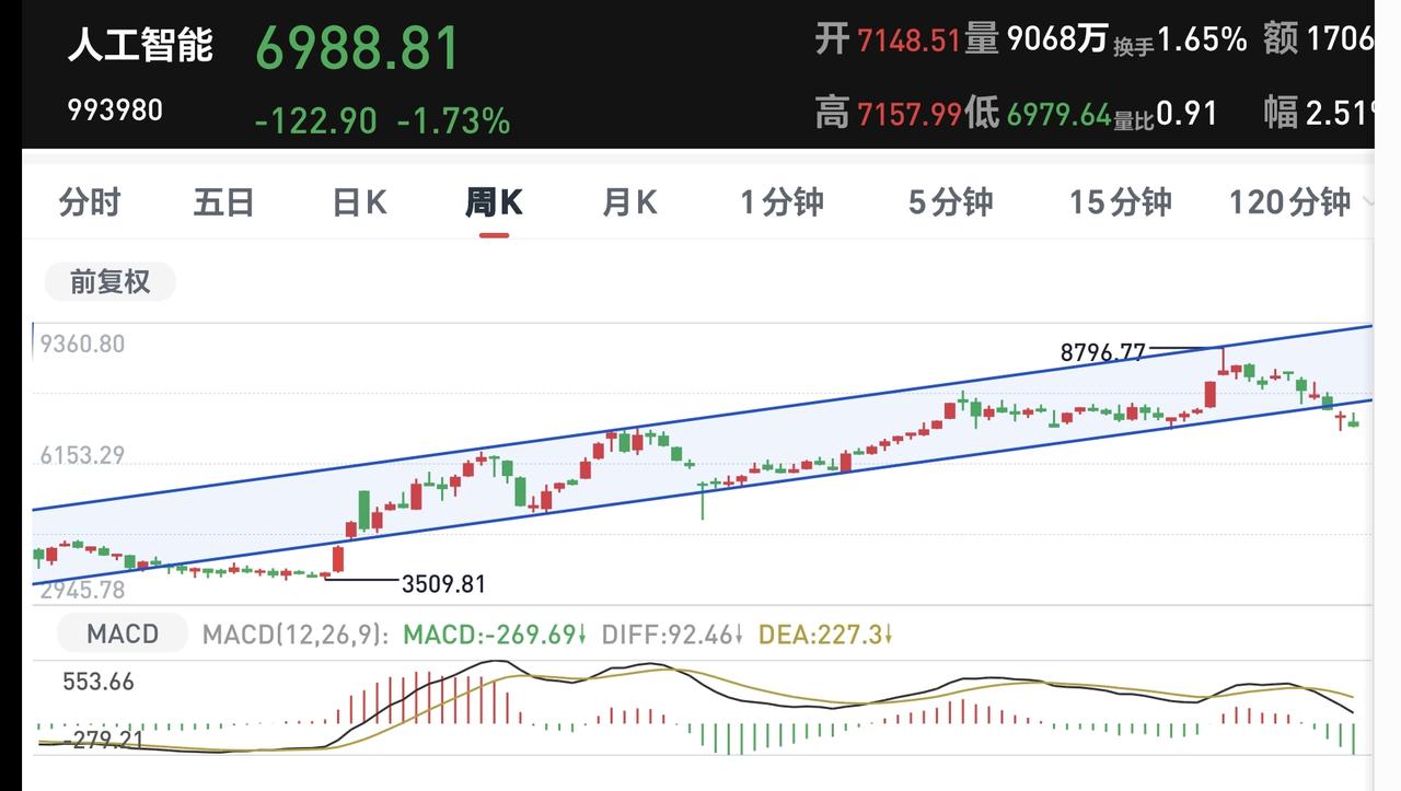 基金:人工智能板块应该怎么办 人工智能板块上周五上涨了0.65%,这个板块的持有人数在所有板块当中排名第11位,散户人数也是不少。 人工智能板块近一个月以来下跌了7.54%,近三个月以来下跌了2.34%,近六个月以来下跌了5.64%,近一年以来上涨了38.61%,近三年以来上涨了23.21%,这个板块有26只基金,各只基金的情况见下面的截图7,近一个月以来,上涨幅度最大的是前海开源人工智能,上涨了6.46%。 人工智能板块日线级别处于短期下跌通道中,现在的位置处于这个下跌通道的下轨线附近,前段时间已经跌破过一次这条下轨线,但后来又收回到了下跌通道内,近期观察是在这条下轨线附近止跌反弹,还是会再次跌破这条下轨线,进入加速下跌走势。 人工智能板块周线级别处于上涨趋势破位中,已经跌破了周线级别上涨通道下轨线三个星期,在日线级别下跌趋势被改变之前,都不要轻易判断这个板块已经企稳止跌。 每个板块都有日线级别的走势和周线级别的走势,有些板块的日线级别和周线级别走势是协调的,也就是同时处于上涨或者下跌趋势中,但有些板块的日线级别和周线级别走势是相反的,也就是日线级别上涨趋势中,周线级别下跌趋势中,或者是日线级别下跌趋势中,周线级别上涨趋势中。 当日线级别和周线级别走势协调的时候,大概率处于主升阶段或者是主跌阶段。当日线级别和周线级别走势不协调的时候,小周期要服从大周期,日线级别要服从周线级别,比如说日线级别趋势向上,周线级别趋势向下,对于这样的板块,我们需要谨慎对待,有机会就要考虑要不要止盈出来观望,而如果日线级别趋势向下,周线级别趋势向上,对于这样的板块,我们在谨慎中要保持乐观,有机会就可以考虑要不要上车。 大盘和板块是同样的情况,大盘是大环境,板块是小环境,当大盘和板块趋势同时向上的时候,我们需要积极的看多做多,当大盘环境不好的时候,板块趋势向上的时候,我们也要保持一定的谨慎,当大盘环境好的时候,板块趋势向下的时候,我们在板块趋势扭转的时候,一定要看多做多。 最近一段时间,大盘的环境不是很好,这也是我们保持谨慎的原因,当看到大盘有止跌企稳迹象的时候,就是我们准备进场的时候,大盘的大环境会带动板块的小环境一起向上。 我写文章请大家过来欣赏,许多人看了以后,什么痕迹都没有留下,走的时候也是一声不吭,连一个点赞,连一句评论都不会留下,走的是那样的无声无息,这样的人是不地道的,没有做人最起码的准则,我不愿意与这样的人交朋友。