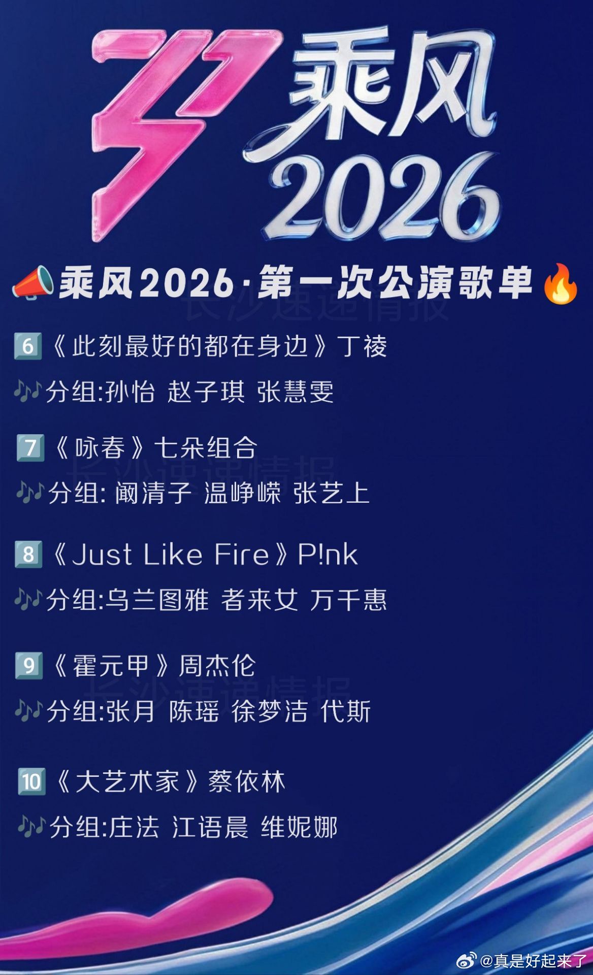 乘风第一次公演分组歌单公布直播时间:4.10-4.11演出地址:乐田智作6号厅主持阵容:谢娜 齐思钧《雨爱》杨丞琳李心洁 谢楠 陈凯琳 徐洁儿《心愿便利贴》元若蓝/大Q秉洛李小冉 唐艺昕 王濛《彩虹的微笑》王心凌萧蔷 陶昕然 安崎《城北的花》王宇宙Leto/乔俊丞叶一茜 范玮琪 侯宇 何宣林《一半一半》Top Barry曾沛慈 黄灿灿 淡淡《此刻最好的都在身边》丁祾孙怡 赵子琪 张慧雯《咏春》七朵组合阚清子 温峥嵘 张艺上《Just Like Fire》P!nk乌兰图雅 者来女 万千惠《霍元甲》周杰伦张月 陈瑶 徐梦洁 代斯《大艺术家》蔡依林庄法 江语晨 维妮娜