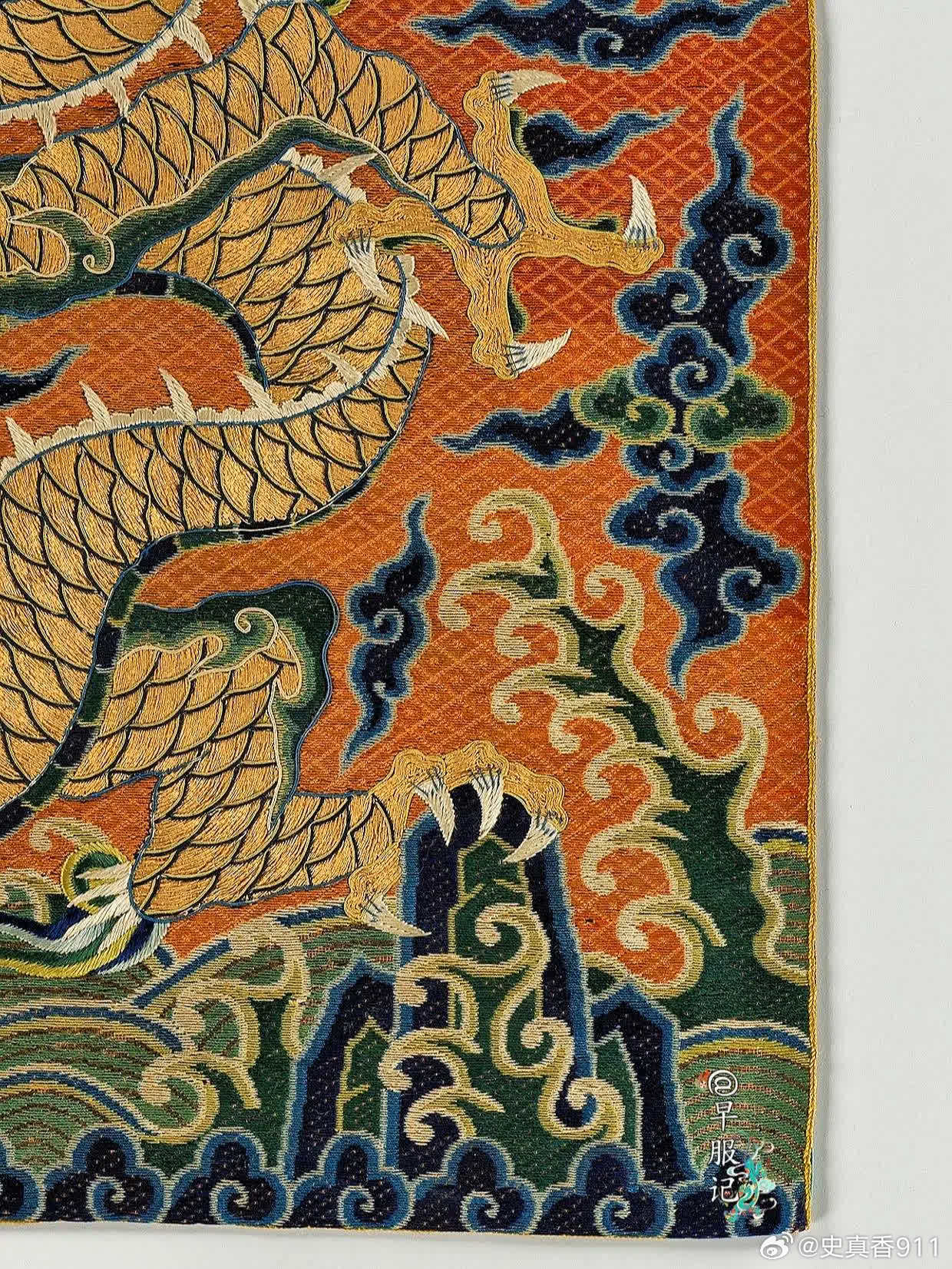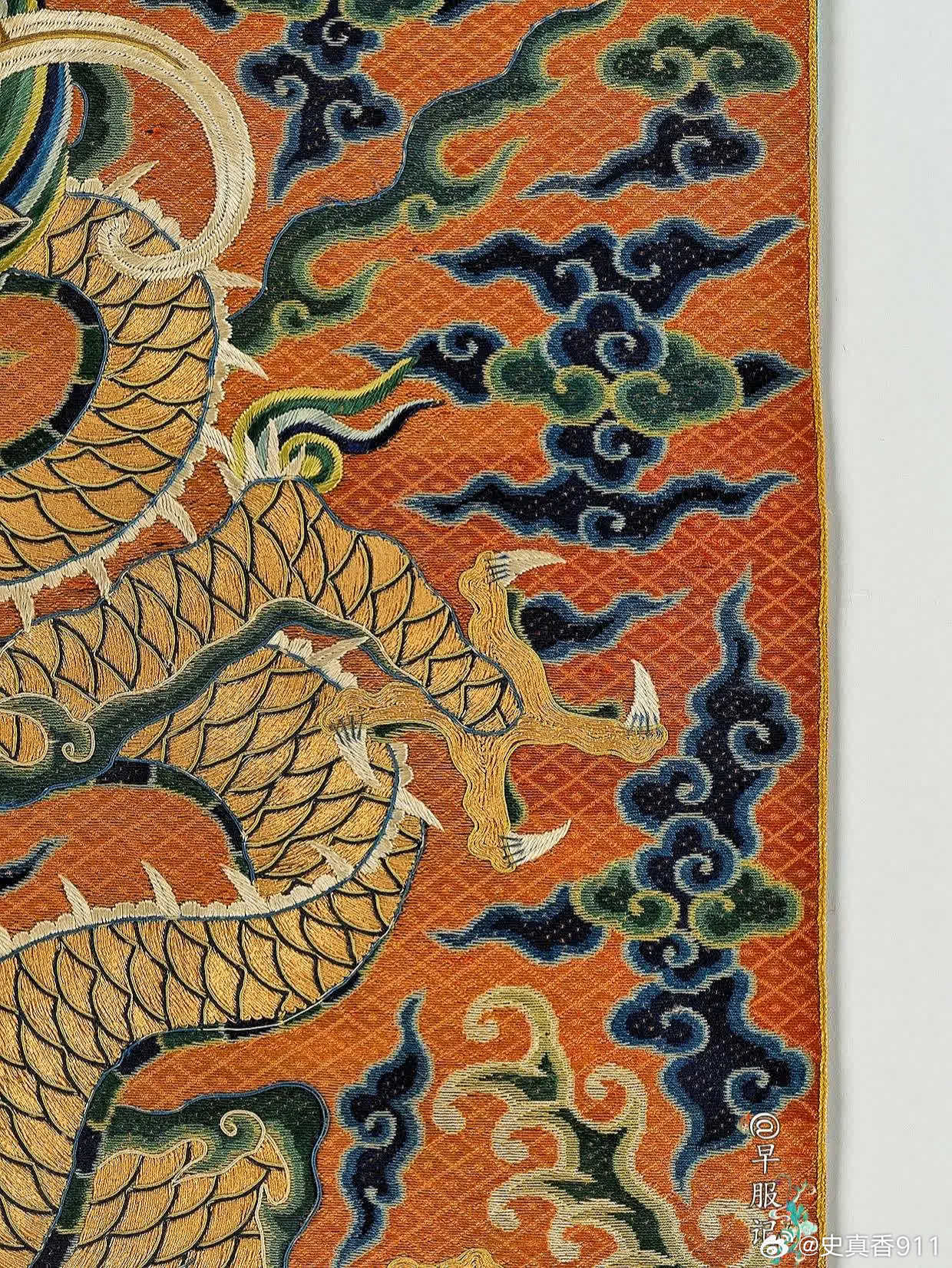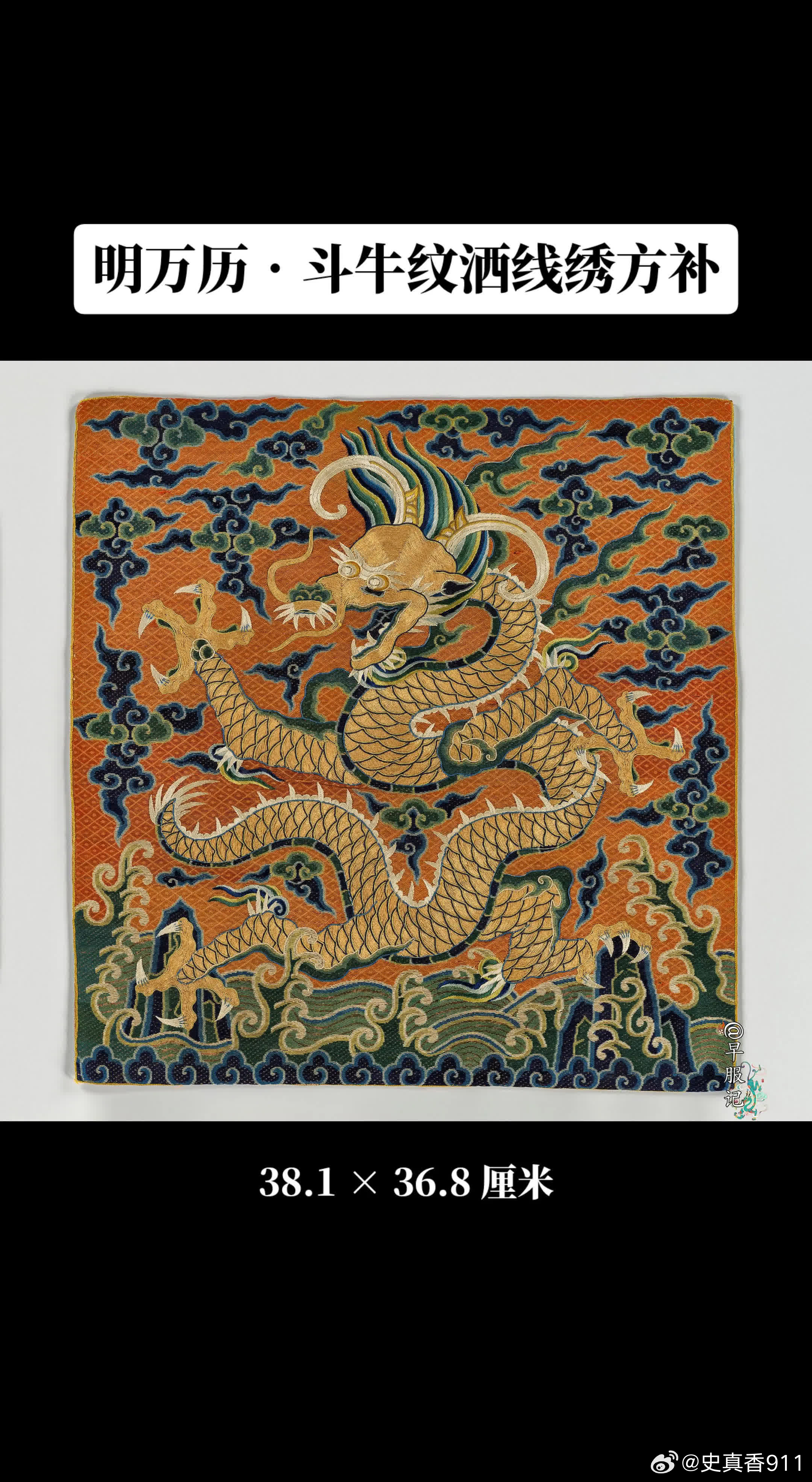 美国纽约大都会艺术博物馆藏:【中国•明万历•洒线绣斗牛方补】,是极为罕见、贵重的御赐官补,尺寸:38.1 × 36.8 厘米,制作于:16世纪末至17世纪初。其醒目的牛角特征表明它的身份——「斗牛纹」,这一纹样为明朝所独有,皇帝御赐才能使用。斗牛纹是明代四大赐服(蟒服、飞鱼服、斗牛服、麒麟服)之第三等纹样,被赏赐穿斗牛服是一种极大的荣宠。该方补使用明代著名的「洒线绣、缉线绣、盘金绣」技法绣制于丝质薄纱之上。以洒线绣铺绣红色菱纹地和云纹,龙身为盘金绣,以缉线绣勾勒龙纹轮廓。构思巧妙,用线讲究,设色浓丽自然,绣工娴熟精湛。此件应为明代宫廷刺绣作坊制品,为明代京绣之精品,是明代刺绣高手所制,是现存明代洒线绣技法最完整的标本之一。2024年,馆方从艾伦·肯尼迪有限公司购买入藏。 【来源】❶D. Clifford Martin 博士和夫人,纽约州华盛顿港,1953 年前拥有;此后由继承人继承;❷?—2007:芭芭拉·塞德林,纽约,2007年售予肯尼迪❸2007—2024:艾伦·肯尼迪有限公司,加利福尼亚州圣莫尼卡,直至 2024 年,售予 MMA❹2024—至今 MMA 【参考书目】❶卡曼,斯凯勒。“中国官吏方格”。《大学博物馆公报》17,第3期(1953年6月),第21-22页,图18。❷卡曼,斯凯勒。“一些奇特的明代神兽”。《东方艺术》,新系列,11,第3期,1(1956),第98页,图5。 【斗牛服】斗牛服是明代极为贵重的官服,是明代四大赐服之一,是次于蟒服、飞鱼服的第三等赐服。通常由皇帝赏赐给三品以上立下功勋的官员,讲官等也有破格获赐的机会,但较为罕见。也被赏赐给王公大臣、少数民族首领、部落首领,有着礼制安邦的功能性和社会属性。斗牛服有圆领、交领等样式,分为斗牛补子式和过肩式斗牛纹两种形制。 【斗牛纹】类龙纹的瑞兽形象:蟒形,牛角,四爪、鱼尾。最大特征是头上两角向下弯曲成牛角状。身形细长,头顶弯曲鬃毛,眼睛上方有分散的鬃毛。在明代,斗牛纹一开始为三爪,后演变为四爪,但到明后期出现五爪的情况。图案寓意:天地万物和谐相处,代表吉祥如意、福寿富贵等观念。 【洒线绣】又称“穿纱绣”。以方目纱为底料,以双股彩色合捻丝线为绣线,在纱地上数计纱孔穿绣,在主体花纹之外铺绣菱形等小几何花纹为地,或在几何地上再绣铺绒主花的一种刺绣工艺。敷彩以原色为主,少量间色,色调对比强烈、鲜艳,风格粗犷,虚实相映,疏密有致。绣制方法有两种,一为正串,一为斜串。因洒线绣平铺、平整,故多用其绣制刺绣品的地子。洒线绣地位:【缉线绣】缉线绣是一种以包梗线绣出纹样轮廓的绣法,是明代著名的绣种。历史