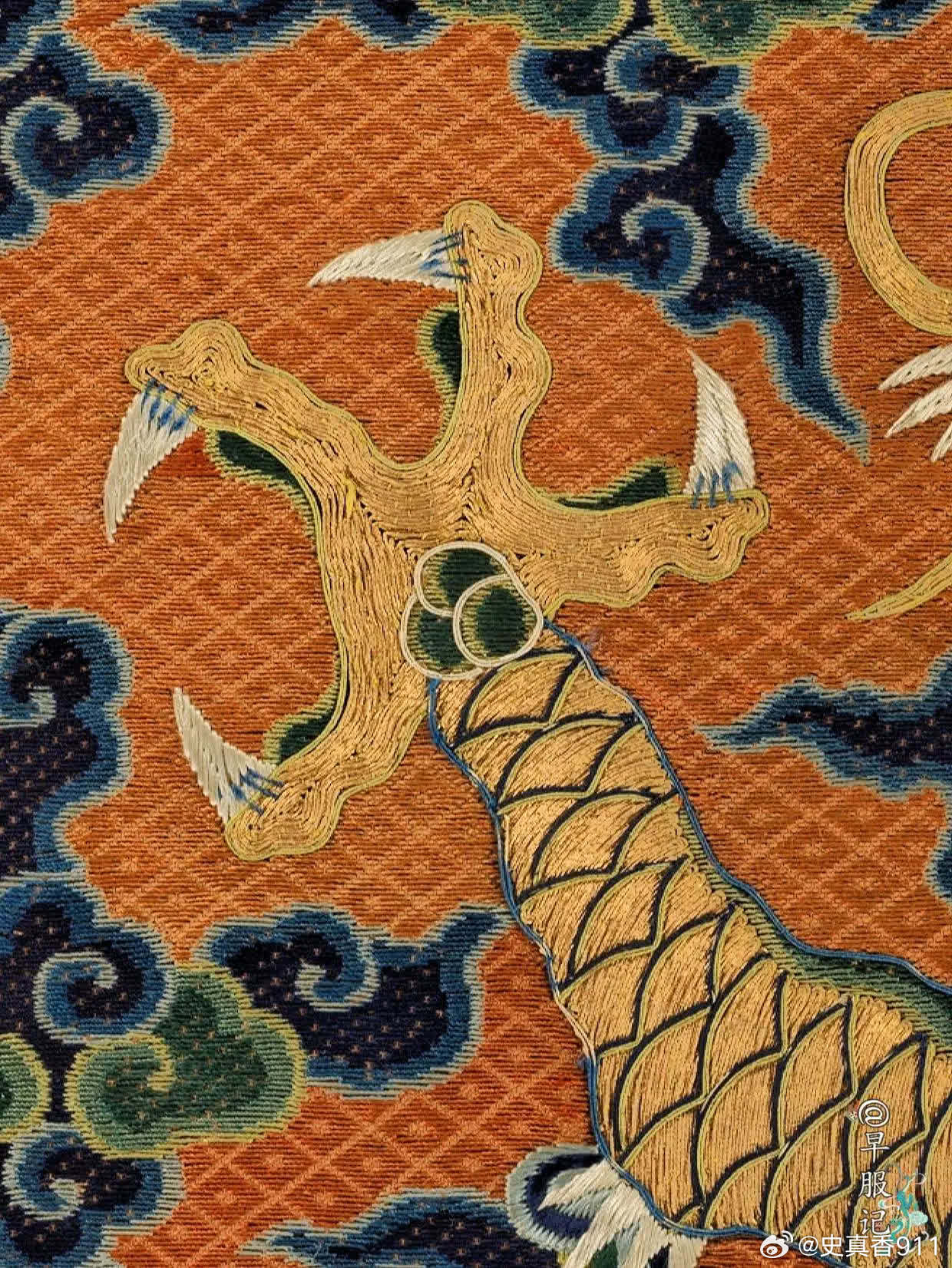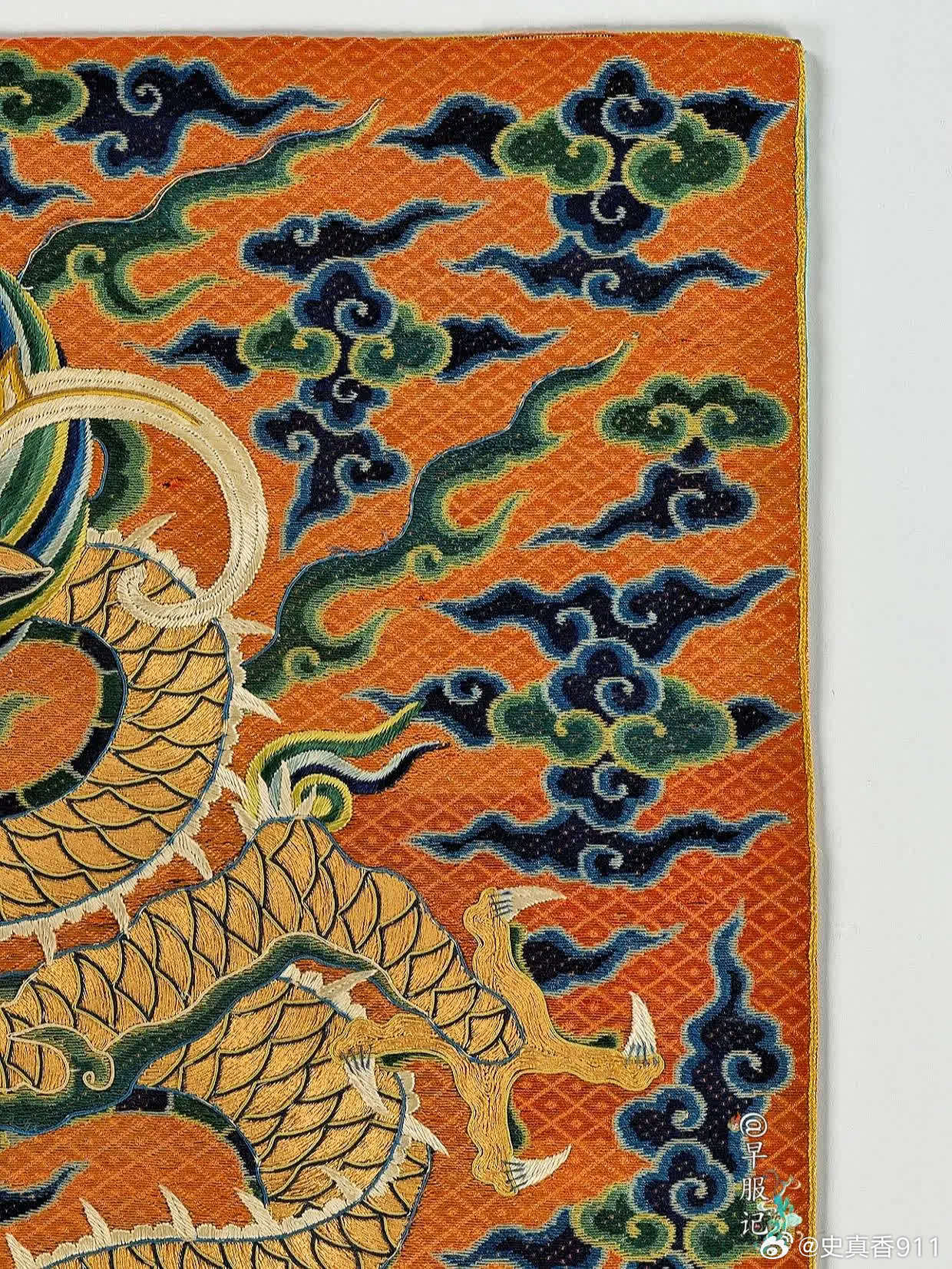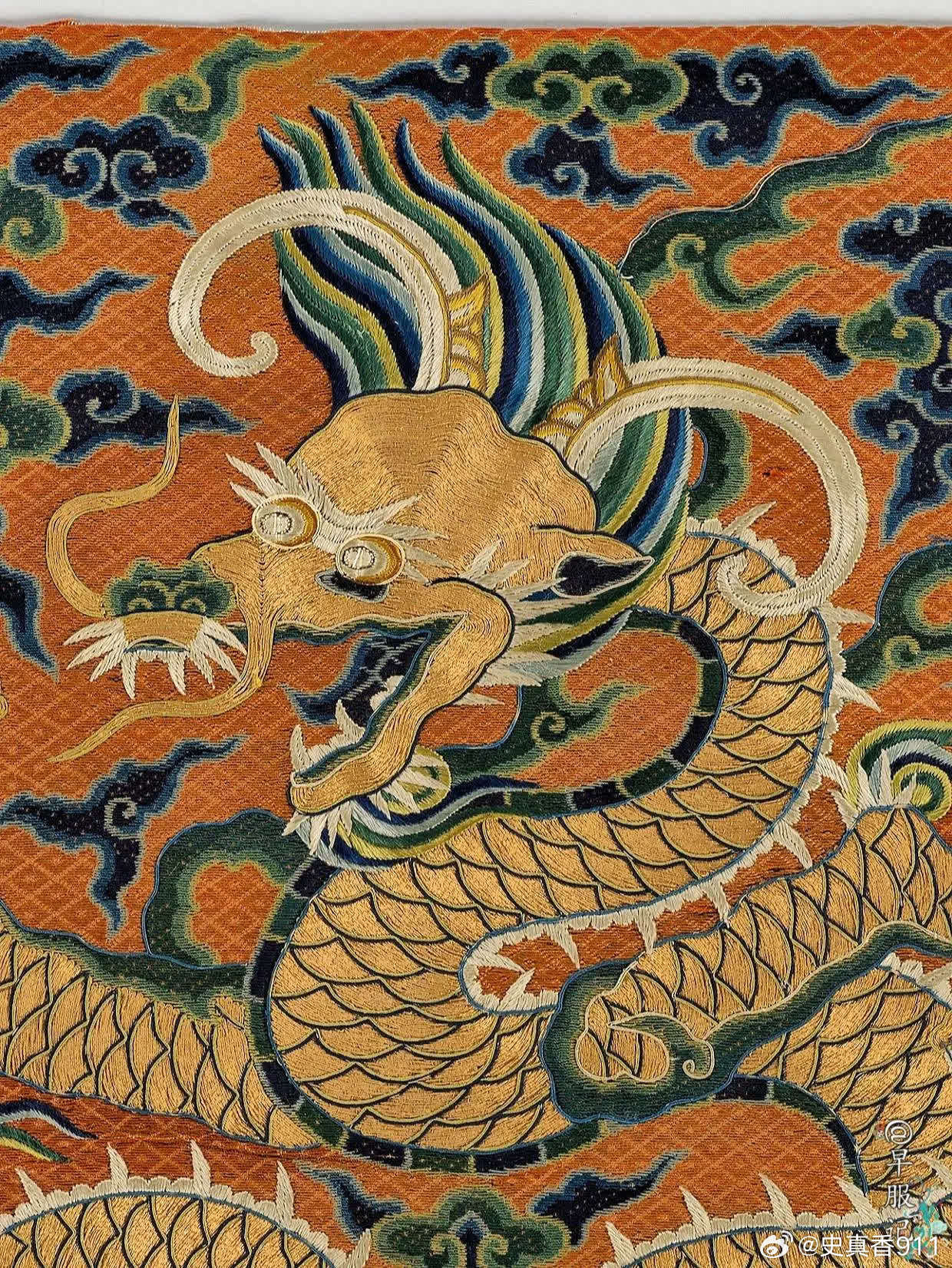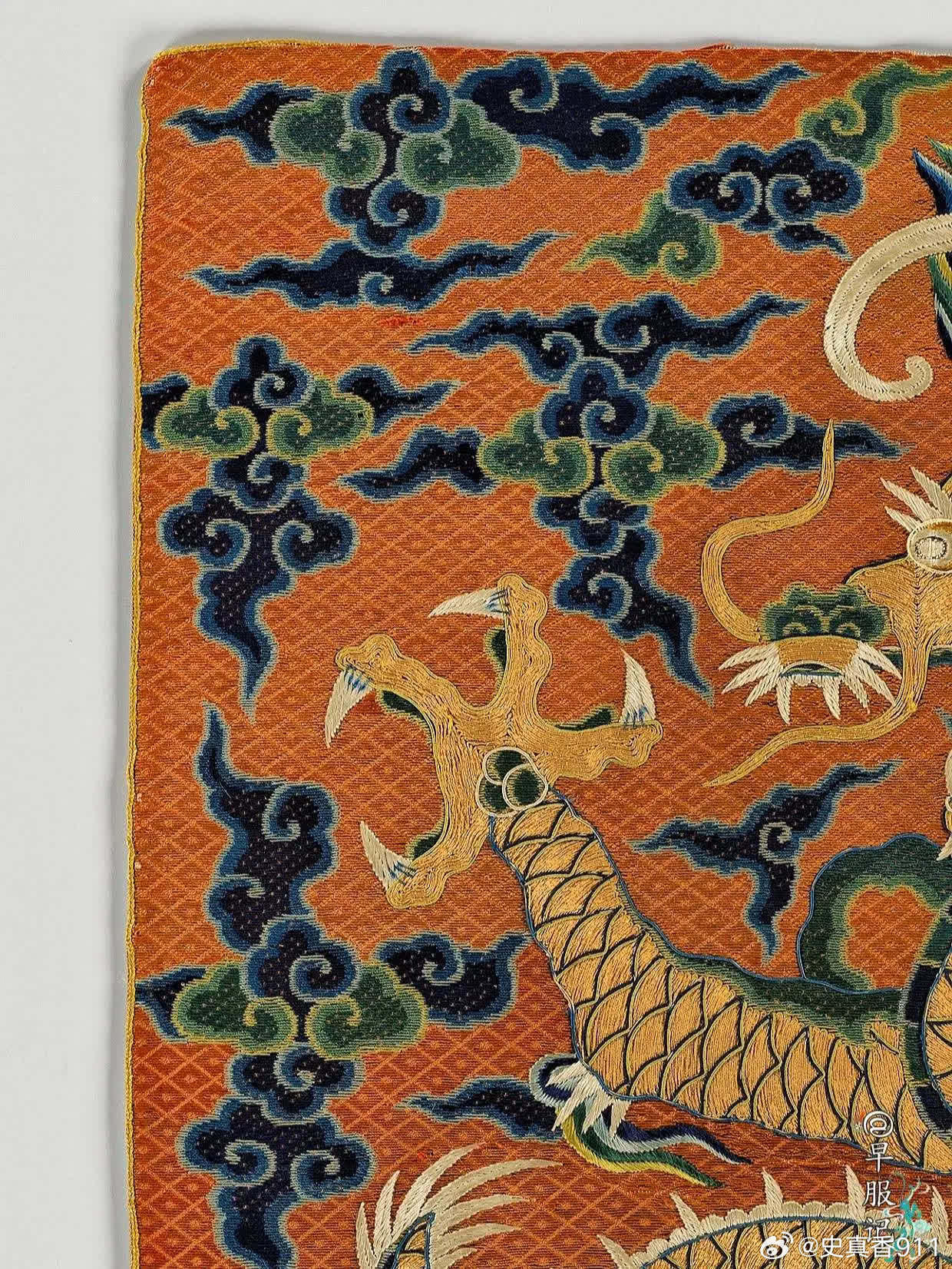美国纽约大都会艺术博物馆藏:【中国•明万历•洒线绣斗牛方补】,是极为罕见、贵重的御赐官补,尺寸:38.1 × 36.8 厘米,制作于:16世纪末至17世纪初。其醒目的牛角特征表明它的身份——「斗牛纹」,这一纹样为明朝所独有,皇帝御赐才能使用。斗牛纹是明代四大赐服(蟒服、飞鱼服、斗牛服、麒麟服)之第三等纹样,被赏赐穿斗牛服是一种极大的荣宠。该方补使用明代著名的「洒线绣、缉线绣、盘金绣」技法绣制于丝质薄纱之上。以洒线绣铺绣红色菱纹地和云纹,龙身为盘金绣,以缉线绣勾勒龙纹轮廓。构思巧妙,用线讲究,设色浓丽自然,绣工娴熟精湛。此件应为明代宫廷刺绣作坊制品,为明代京绣之精品,是明代刺绣高手所制,是现存明代洒线绣技法最完整的标本之一。2024年,馆方从艾伦·肯尼迪有限公司购买入藏。 【来源】❶D. Clifford Martin 博士和夫人,纽约州华盛顿港,1953 年前拥有;此后由继承人继承;❷?—2007:芭芭拉·塞德林,纽约,2007年售予肯尼迪❸2007—2024:艾伦·肯尼迪有限公司,加利福尼亚州圣莫尼卡,直至 2024 年,售予 MMA❹2024—至今 MMA 【参考书目】❶卡曼,斯凯勒。“中国官吏方格”。《大学博物馆公报》17,第3期(1953年6月),第21-22页,图18。❷卡曼,斯凯勒。“一些奇特的明代神兽”。《东方艺术》,新系列,11,第3期,1(1956),第98页,图5。 【斗牛服】斗牛服是明代极为贵重的官服,是明代四大赐服之一,是次于蟒服、飞鱼服的第三等赐服。通常由皇帝赏赐给三品以上立下功勋的官员,讲官等也有破格获赐的机会,但较为罕见。也被赏赐给王公大臣、少数民族首领、部落首领,有着礼制安邦的功能性和社会属性。斗牛服有圆领、交领等样式,分为斗牛补子式和过肩式斗牛纹两种形制。 【斗牛纹】类龙纹的瑞兽形象:蟒形,牛角,四爪、鱼尾。最大特征是头上两角向下弯曲成牛角状。身形细长,头顶弯曲鬃毛,眼睛上方有分散的鬃毛。在明代,斗牛纹一开始为三爪,后演变为四爪,但到明后期出现五爪的情况。图案寓意:天地万物和谐相处,代表吉祥如意、福寿富贵等观念。 【洒线绣】又称“穿纱绣”。以方目纱为底料,以双股彩色合捻丝线为绣线,在纱地上数计纱孔穿绣,在主体花纹之外铺绣菱形等小几何花纹为地,或在几何地上再绣铺绒主花的一种刺绣工艺。敷彩以原色为主,少量间色,色调对比强烈、鲜艳,风格粗犷,虚实相映,疏密有致。绣制方法有两种,一为正串,一为斜串。因洒线绣平铺、平整,故多用其绣制刺绣品的地子。洒线绣地位:【缉线绣】缉线绣是一种以包梗线绣出纹样轮廓的绣法,是明代著名的绣种。历史