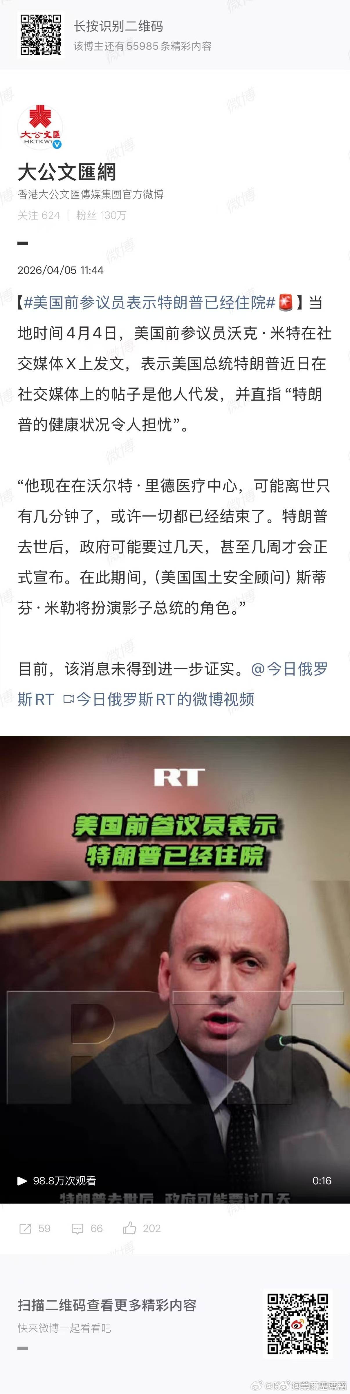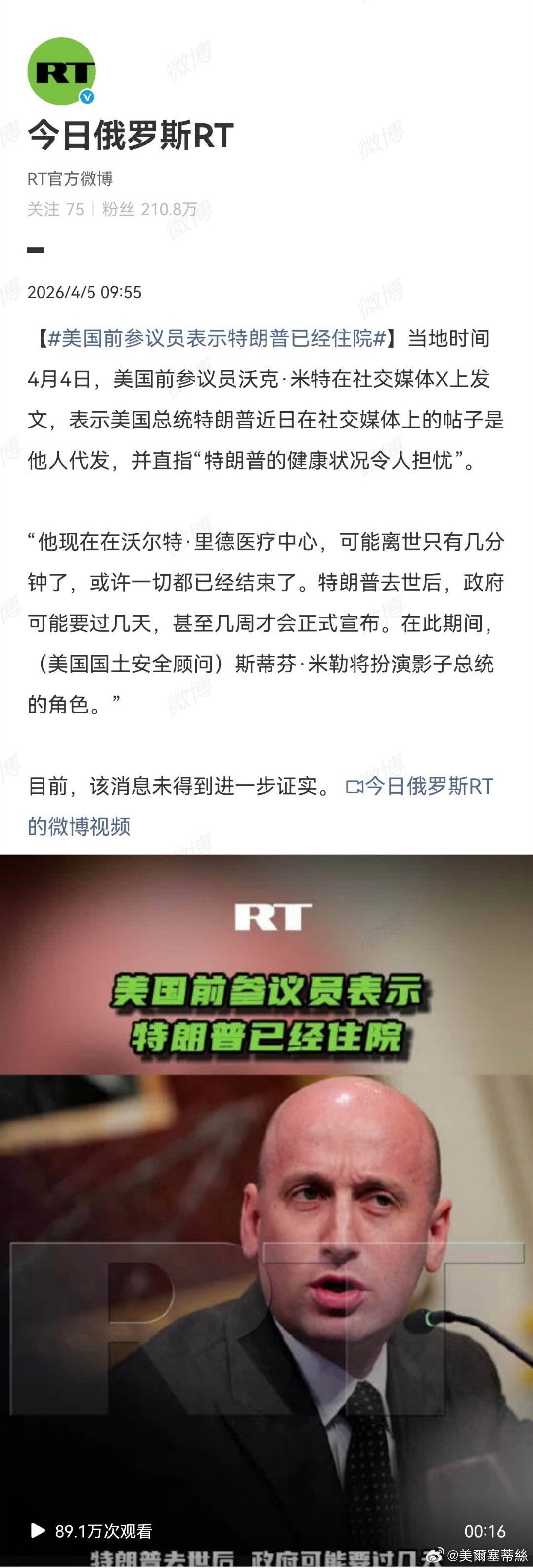 愚人節系列 今日俄羅斯RT、大公民匯網:美國前參議員說川普住院 你們那裡都已經4月5日了,愚人節玩high了,還想繼續玩下去是嗎?