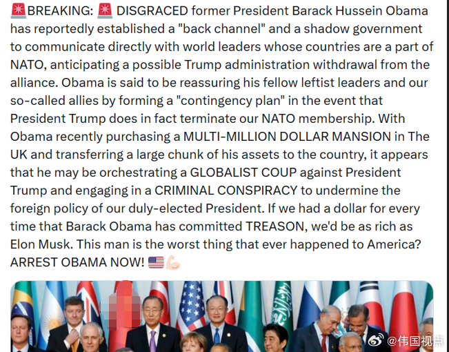 声名狼藉的美国前总统奥巴马据报道已经建立了一个“秘密渠道”和一个影子政府,用于直接与那些属于北约的国家领导人沟通,以应对特朗普政府可能退出该联盟的情况。