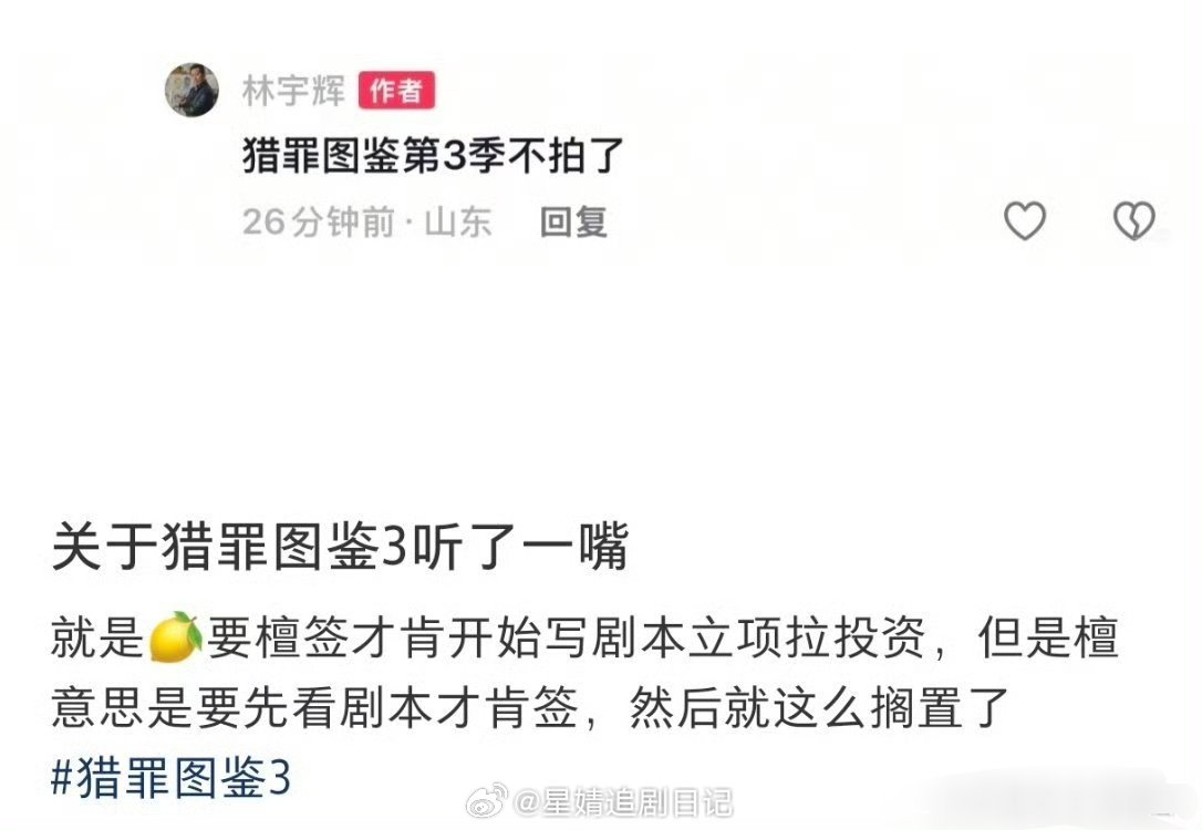 看到说《猎罪图鉴3》不拍了~ 为什么不拍第三季了啊,第二季热度不高吗?我想肯定要看到剧本再决定演不演啊,这是对作品负责,对观众负责。这波支持檀健次。