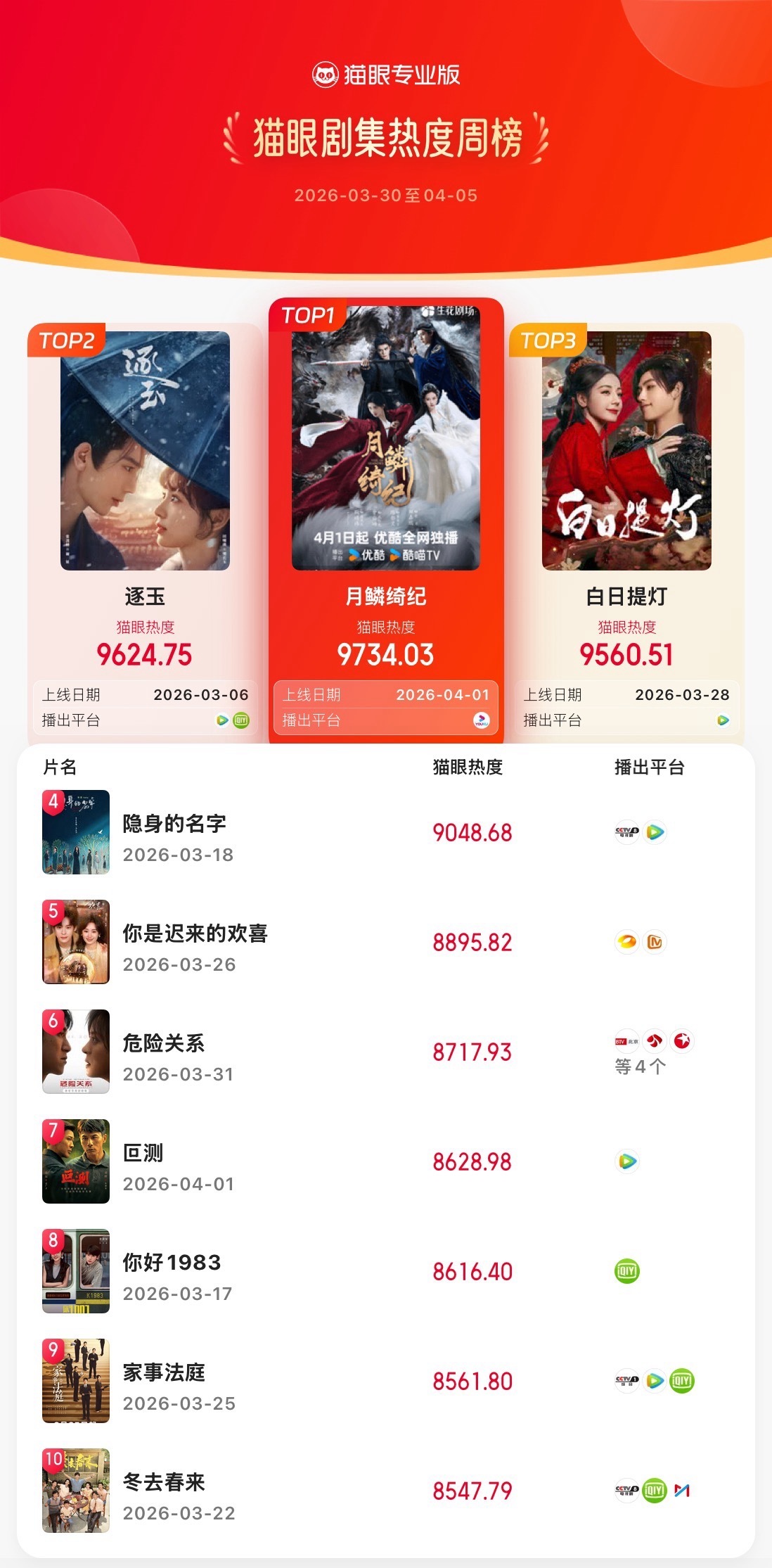 月鳞绮纪双榜登顶 据猫眼专业版数据,、、、(排名不分先后)领衔主演网络剧《月鳞绮