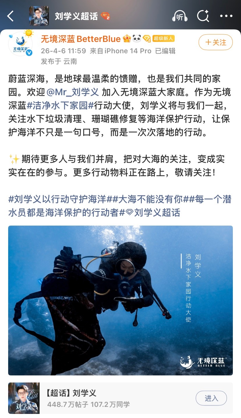 刘学义以行动守护海洋 ❄️刘学义江山大同 一直以来都在关注海洋环境保护问题,刘学义从跟节目组一起乘船捕捞海洋垃圾再到练习潜水到水下清理海洋垃圾、修复珊瑚礁。这四年里用实际行动让大家持续关注海洋环境保护,真的满满都是正能量大海不能没有你❄️每一个潜水员都是海洋保护的行动者