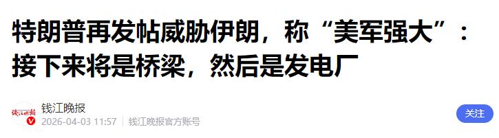特朗普发文说:“周二将是伊朗的‘电厂日’和‘大桥日’,两者合二为一!绝对前所未有!赶紧打开霍尔木兹海峡,你们这些疯子,否则就等着下地狱吧!等着瞧!赞美真主。唐纳德·J·特朗普总统” 特朗普这不是简单的口头警告,而是赤裸裸的武力威胁,而且他选的打击目标,全是伊朗老百姓赖以生存的基础民生设施。 特朗普口中的“电厂日”和“大桥日”,说白了就是要对伊朗的发电厂和大桥动手,这两种设施对伊朗平民的生活来说,至关重要,缺一不可。 发电厂是整个国家的能源命脉,一旦被打击毁坏,伊朗全国就会陷入大面积停电,老百姓家里用不了电,冰箱里的食物会变质,冬天没法取暖、夏天没法降温,日常的照明、做饭都会成问题。 更关键的是,医院的医疗设备、急救系统也需要电力支撑,停电会直接影响病人的救治,甚至可能导致重症患者失去生命。 大桥则是伊朗的交通枢纽,连接着各个城市和地区,不管是老百姓出行,还是粮食、药品等生活物资的运输,都离不开大桥,一旦大桥被炸毁,物资运输就会陷入瘫痪,偏远地区的老百姓可能会面临断粮、断药的困境,正常的生产生活都会被彻底打乱。 特朗普之所以要拿电厂、大桥这种关系百姓生死的民生目标开刀,根本不是为了所谓的“维护地区和平”,核心目的就是想把伊朗平民绑在谈判桌上,用饥饿、黑暗和绝望逼伊朗屈服。 这些年,特朗普政府一直对伊朗采取围堵、制裁的政策,之前还曾单方面袭击过伊朗的核设施,试图从各个方面打压伊朗,但伊朗一直没有低头,始终坚守自己的立场。 现在特朗普眼看常规的制裁和威胁起不到作用,就想出了这种卑劣的办法,把矛头对准无辜的平民,想用平民的苦难来施压伊朗政府,逼他们在谈判中让步,打开霍尔木兹海峡,满足美国的利益诉求。 其实,这已经不是特朗普第一次对伊朗发出这样的威胁了。在此之前,他就曾多次给伊朗设定所谓的“最后期限”,一开始说4月6日前要伊朗达成协议、开放霍尔木兹海峡,后来又自行推迟到4月7日晚上8点,反复无常的表态,也让很多人对他的威胁产生了质疑,但不可否认的是,这种威胁背后,是美国对伊朗的持续施压和霸权野心。 霍尔木兹海峡是全球重要的石油运输通道,伊朗凭借地理优势控制着这条海峡,将其作为抗衡美国的重要筹码,而美国一直想掌控这条海峡,保障自己的能源利益,这也是特朗普不断向伊朗施压的重要原因之一。 面对特朗普的威胁,伊朗方面并没有退缩,反而接连作出强硬回应。伊朗最高领袖穆杰塔巴·哈梅内伊明确表示,伊朗人民会继续开展国土防御行动,封锁霍尔木兹海峡这一战略杠杆也会继续运用。 伊朗伊斯兰议会议长卡利巴夫更是直接指出,特朗普的鲁莽举动会把美国拖入地狱,还会让整个中东地区陷入战火,通过战争罪行什么都得不到。伊朗外交部发言人也表示,特朗普威胁攻击伊朗关键基础设施,相当于煽动战争罪和危害人类罪,伊朗会对任何攻击作出回应,包括打击美国及其相关设施。 不仅如此,特朗普的这种威胁就连美国国内和国际社会都不认可。美国弗吉尼亚州民主党参议员蒂姆·凯恩批评说,政府的言辞令人尴尬和幼稚,美国在没有明确理由的情况下陷入一场战争,再多的强硬言论也掩盖不了这个事实。 事实上,美国情报界也评估过,伊朗短期内不太可能放松对霍尔木兹海峡的控制,伊朗已经从控制海峡中尝到了甜头,会继续把它作为谈判筹码。而且,伊朗的防御能力也不容小觑,哪怕美军动用武力,也很难轻易“打通”霍尔木兹海峡,反而可能陷入被动。 特朗普之前也有过推迟“最后期限”的先例,这一次,他的威胁到底会不会兑现,还很难说,但可以肯定的是,他这种拿无辜平民当筹码的做法,既卑劣又不道德,也违背了国际法和人道主义原则。 现在,巴基斯坦、阿曼等国正在努力斡旋,中俄外长也共同呼吁尽快停火止战,希望通过外交途径解决霍尔木兹海峡的通航问题。 但特朗普的强硬威胁,无疑给局势增添了更多的不确定性。说到底,特朗普的核心目的就是想逼迫伊朗屈服,满足美国的霸权诉求,而他选择的手段,却是牺牲伊朗平民的利益,用饥饿、黑暗和绝望来施压,这种做法不仅不会让伊朗屈服,反而会激起伊朗人民的反抗,也会让美国在国际社会上更加孤立。 特朗普的这条威胁帖子,看似强硬,实则暴露了他的无助和急躁。他以为通过威胁打击民生设施,就能让伊朗低头,但他低估了伊朗人民的决心,也低估了国际社会的正义力量。 伊朗不会因为这种卑劣的威胁就放弃自己的立场,而美国如果真的敢动手,必将付出沉重的代价。说到底,这种拿无辜平民开刀的霸权行径,终究是不得人心的,也不可能达到自己想要的目的,反而会让更多人看清美国的霸权本质,让美国在国际舞台上失去更多的信任和支持。