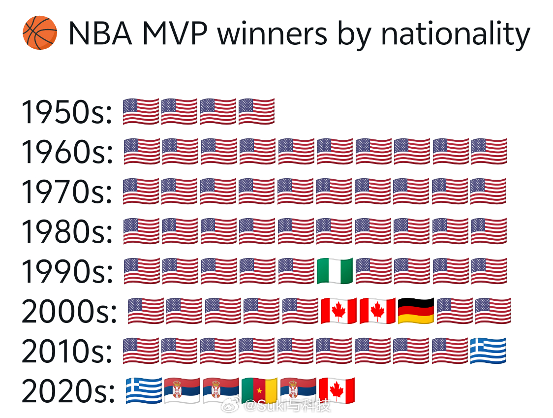 看着这张NBA MVP国籍分布图,才意识到美国本土球员的统治时代真的在慢慢过去。从50年代开始清一色的星条旗,到如今日趋多元的国际面孔——希腊的字母哥、塞尔维亚的约基奇、喀麦隆的恩比德...篮球这项运动,真的越来越"世界一家"了。
