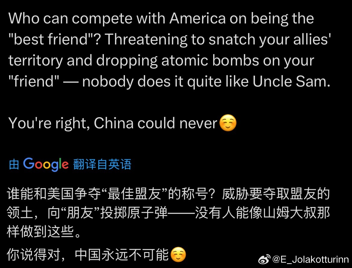 我:“在做好朋友这方面谁能赛得过美国呢?往好朋友头上丢核弹,威胁要抢好朋友的土地,这下做事情中国的确做不来”