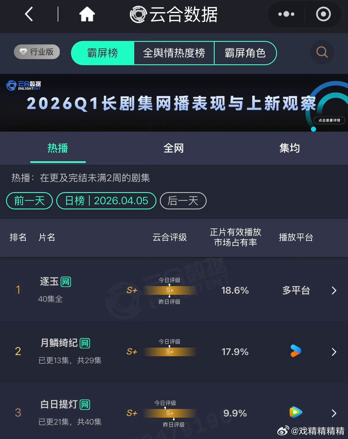 月鳞绮纪云合占比17.9%,白日提灯云合占比9.9,这次热巴的剧粉丝全程盯着妆造