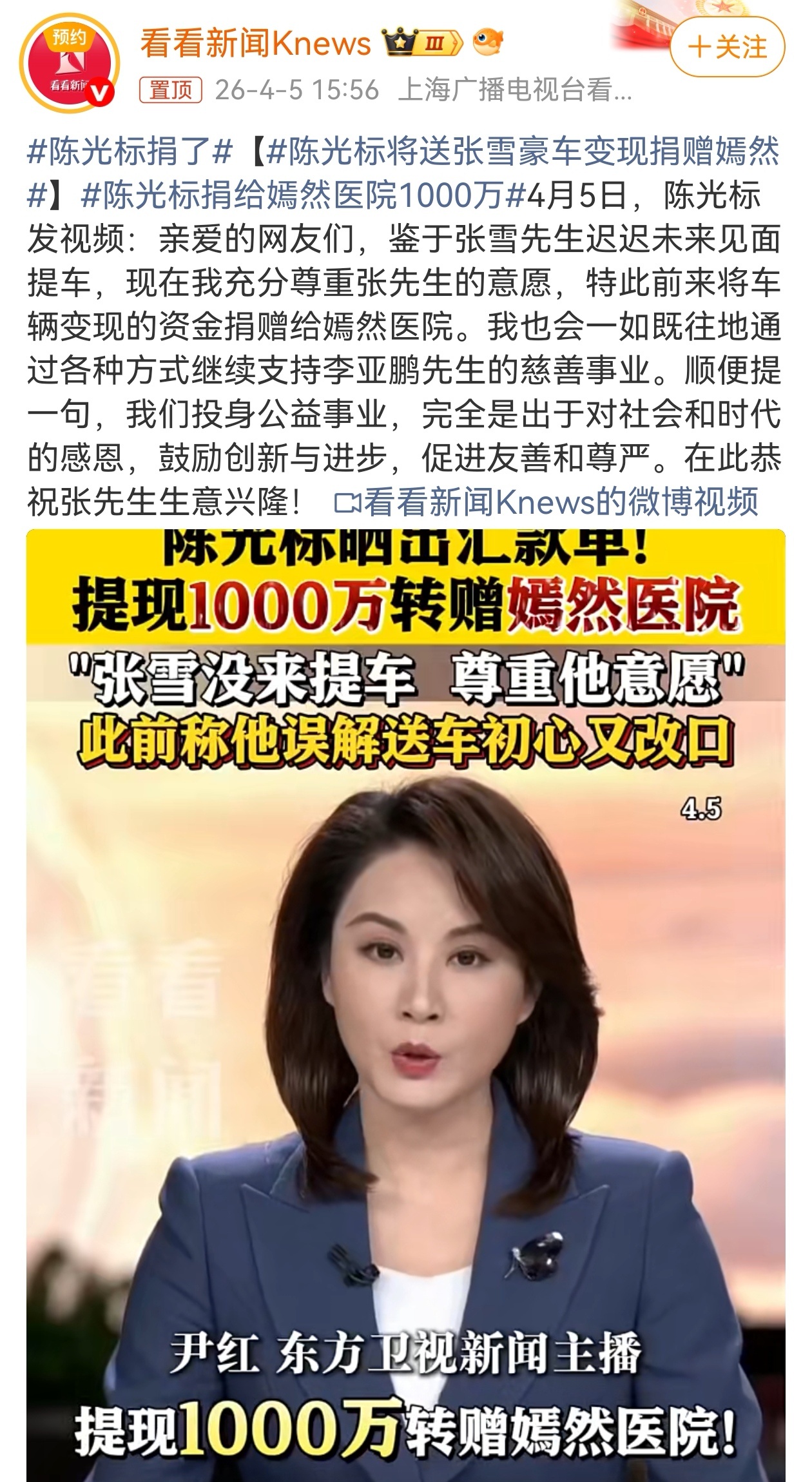 针对“高调赠车”事件,陈光标最终选择直接向嫣然天使基金捐款1000万,并明确表示车辆不再赠予,归自己所有。无论陈光标初衷如何,公益行为的最终社会价值得以体现,陈光标算是体面了一回。