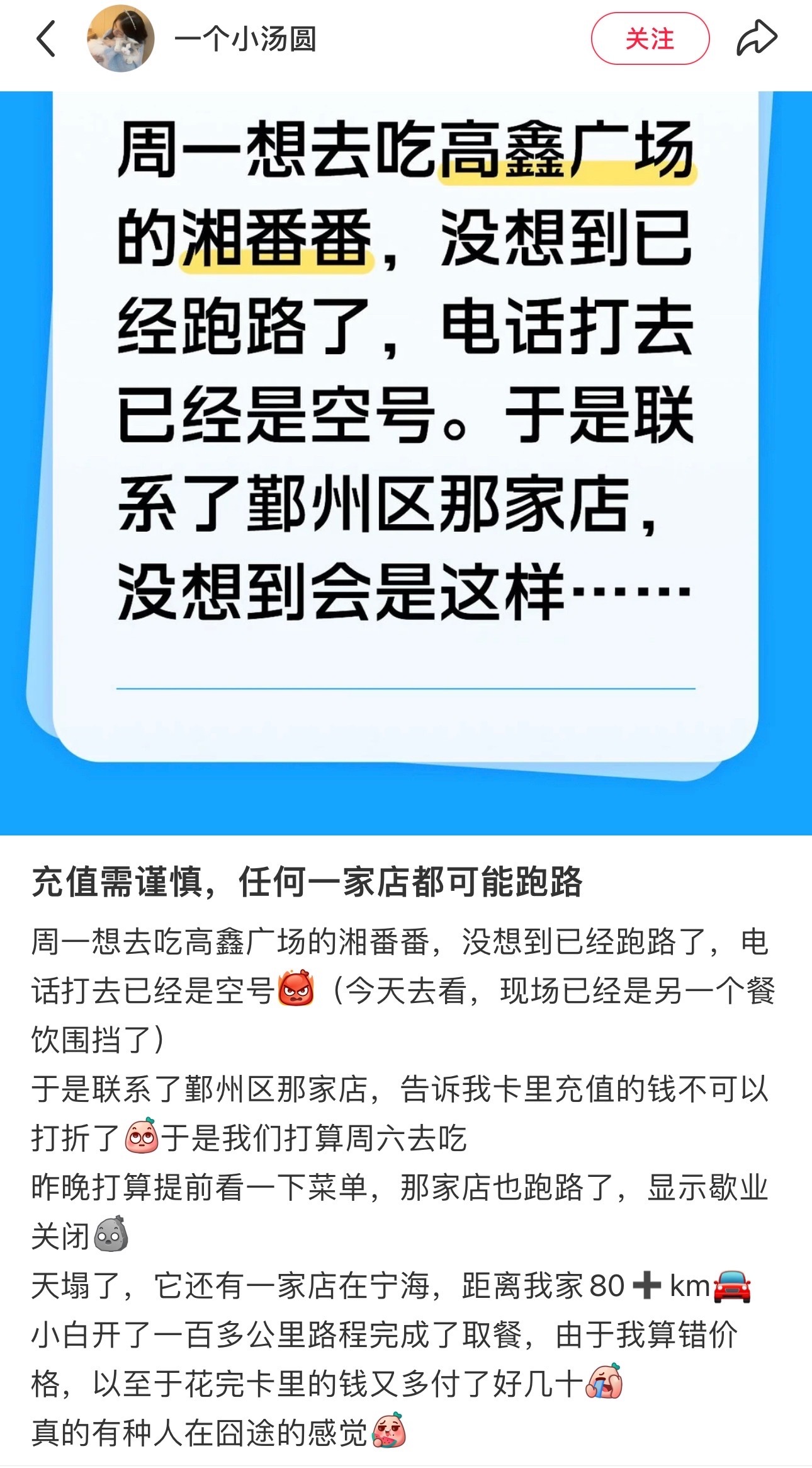 网友称高鑫广场湘番番闭店为用余额跑去宁海 ,评论区有网友提示用卡还有别的去处…还没用完储值卡的朋友注意了!宁波网友“一个小汤圆”爆料:充值需谨慎,任何一家店都可能跑路上周一想去吃高鑫广场的湘番番,没想到已经跑路了,电话打去已经是空号(今天去看,现场已经是另一个餐饮围挡了)于是联系了鄞州区那家店,告诉我卡里充值的钱不可以打折了于是我们打算周六去吃昨晚打算提前看一下菜单,那家店也跑路了,显示歇业关闭天塌了,它还有一家店在宁海,距离我家80➕km🚘小白开了一百多公里路程完成了取餐,由于我算错价格,以至于花完卡里的钱又多付了好几十…真的有种人在囧途的感觉