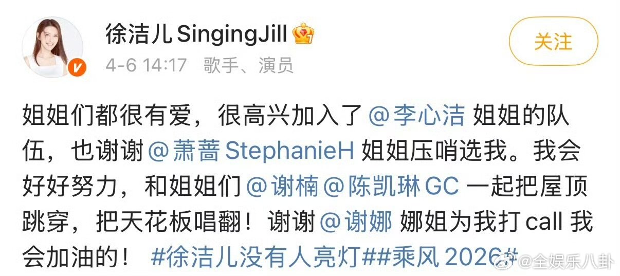 徐洁儿回应没有人亮灯乘风2026 实力在线心态还好,徐洁儿这次乘风之旅肯定大放异