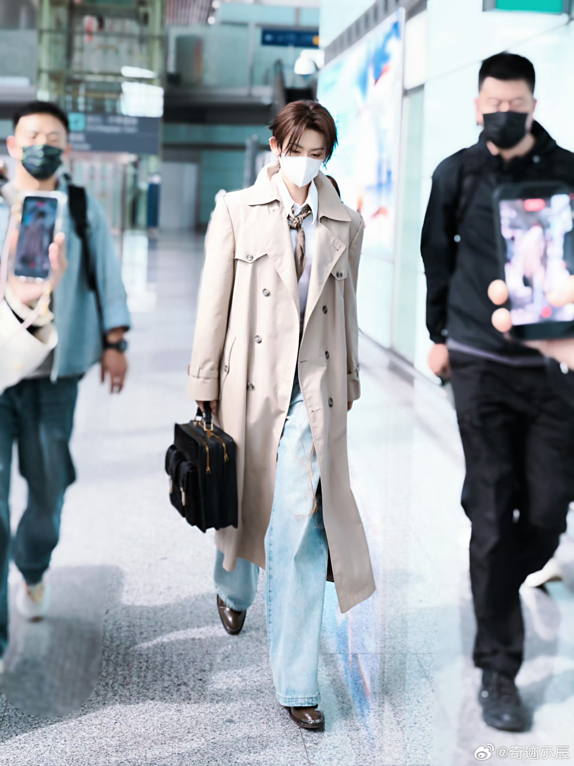 小鬼路透机场变秀场小鬼机场造型鲨疯全场,风衣衬衫+公文包复古又时髦,口罩都遮不住