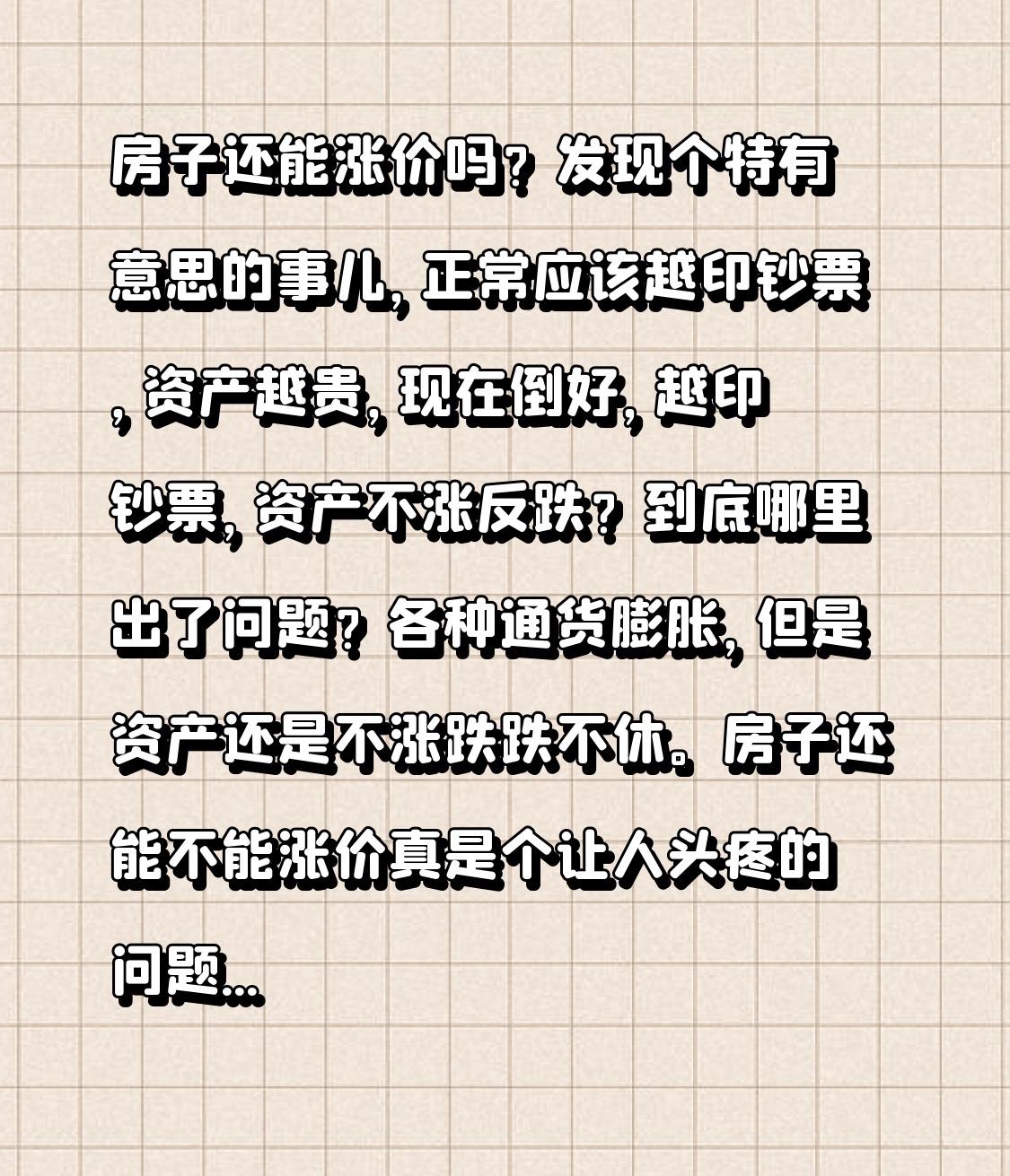 房子还能涨价吗?发现个特有意思的事儿,正常应该越印钞票,资产越贵,现在倒好,越印
