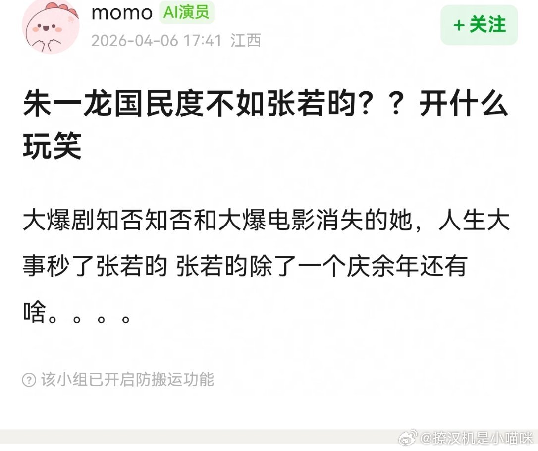 朱一龙国民度碾压张若昀?《庆余年》再爆也抵不过30亿票房的降维打击!谁还在说朱一龙国民度不如张若昀?简直是滑天下之大稽!别拿《庆余年》的爆吹上天了,张若昀这辈子最拿得出手的,好像也就剩这一部剧了?反观朱一龙,《知否知否应是绿肥红瘦》直接爆成国民级古偶,齐衡一角火遍大江南北,男女老少谁不认识?更别说《消失的她》狂揽30多亿票房,直接冲进影史前列,观影人次根本不比《庆余年》的追剧人数少!有人说《庆余年》受众广?可电视剧的热度是一时的,电影票房才是实打实的真金白银!张若昀除了《庆余年》,还有能打的代表作吗?后续作品水花寥寥,而朱一龙呢?一部接一部的电影饼拿到手软,影视寒冬里照样部部开机,资源断层式碾压!别扯什么不是一个赛道,国民度拼的就是全年龄段认知度!上到爸妈辈追《知否》,下到年轻人冲《消失的她》,朱一龙的国民度早就全方位覆盖了。张若昀靠一部剧吃一辈子,拿什么跟朱一龙比?