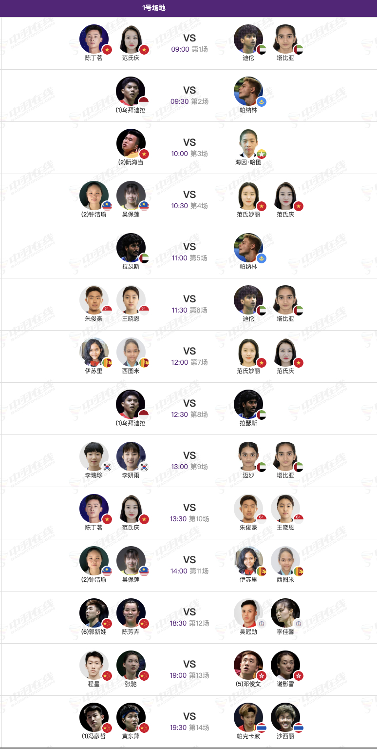 【1号场地】12、郭新娃/陈芳卉🇨🇳 vs 吴冠勋/李佳馨13、程星/张驰🇨🇳 vs 🇭🇰邓俊文/谢影雪14、冯彦哲/黄东萍🇨🇳 vs 🇹🇭帕克卡波/沙西丽