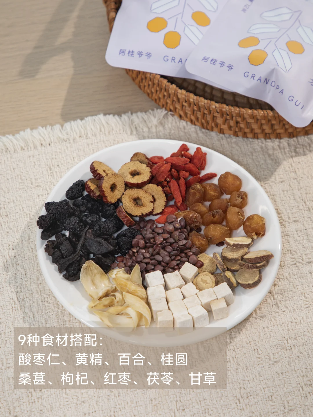 9种食材搭配: 酸枣仁、黄精、百合、桂圆、桑葚、枸杞、红枣、茯苓、甘草