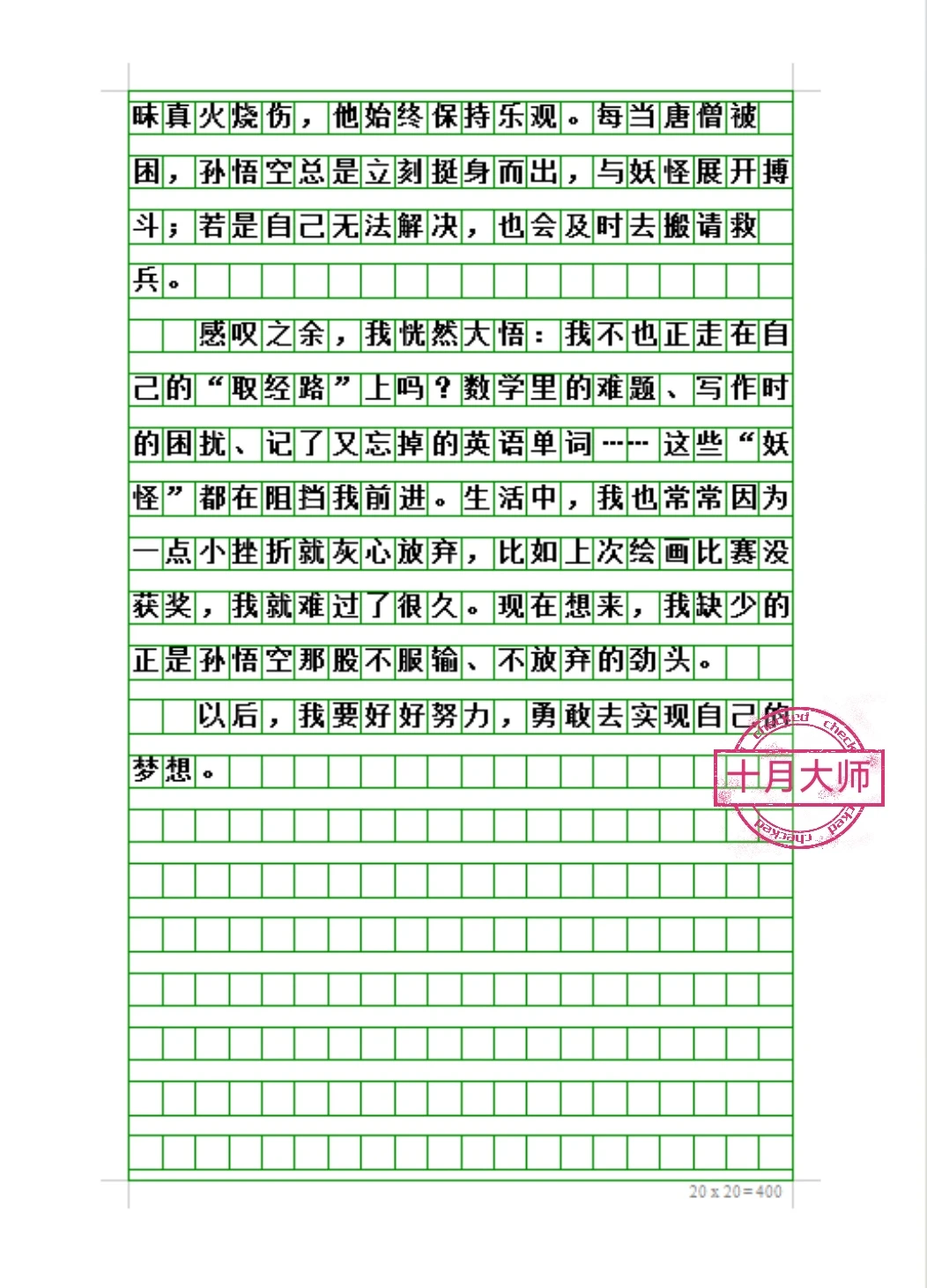感叹之余,我恍然大悟:我不也正走在自己的“取经路”上吗?数学里的难题、写作时的困扰、记了又忘掉的英语单词……这些“妖怪”都在阻挡我前进。生活中,我也常常因为一点小挫折就灰心放弃,比如上次绘画比赛没获奖,我就难过了很久。现在想来,我缺少的正是孙悟空那股不服输、不放弃的劲头。