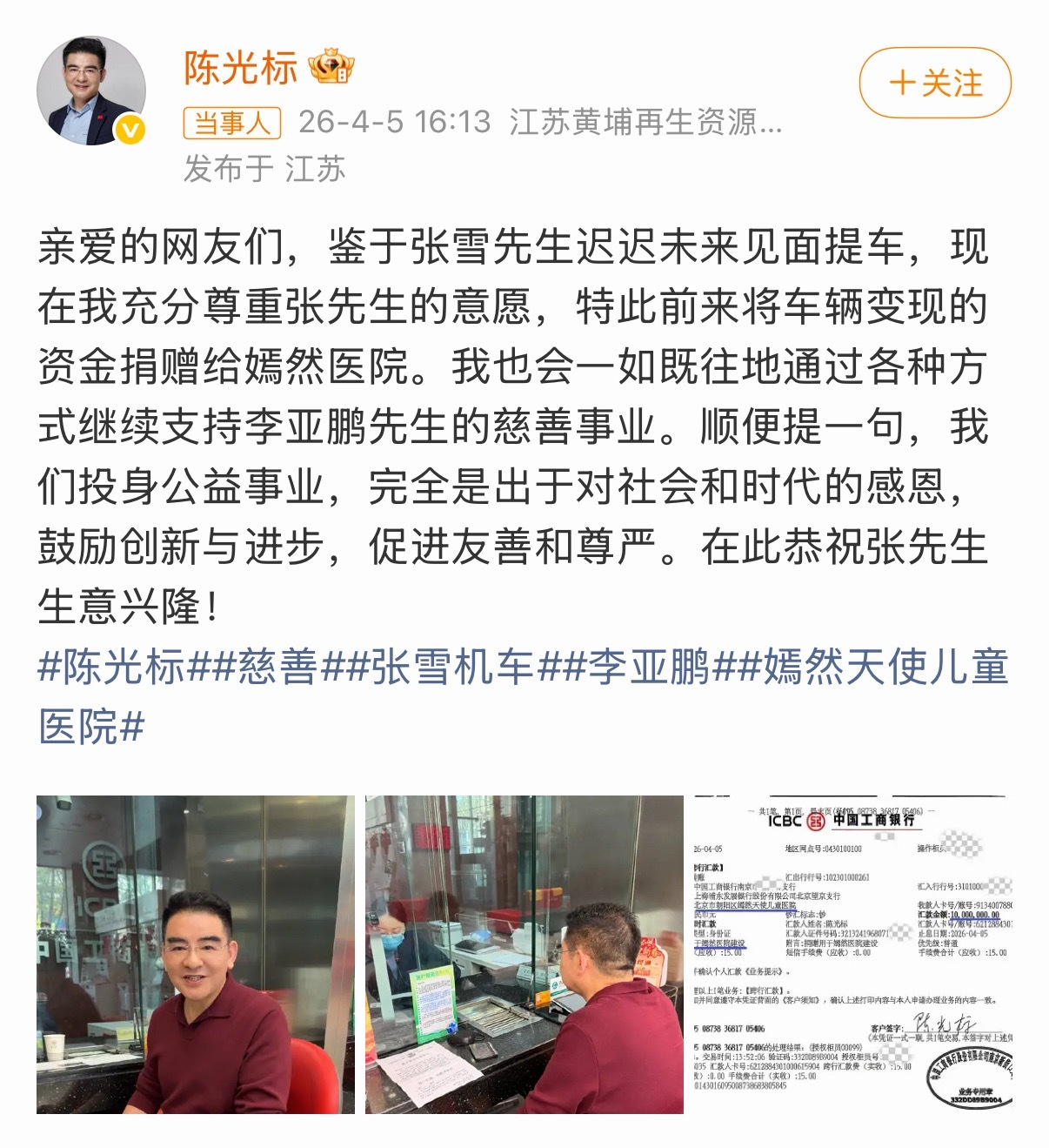 张雪回应陈光标捐款1000万不管陈光标是为了流量还是啥,最起码真捐了,而且还是以个人名义,先生大义!