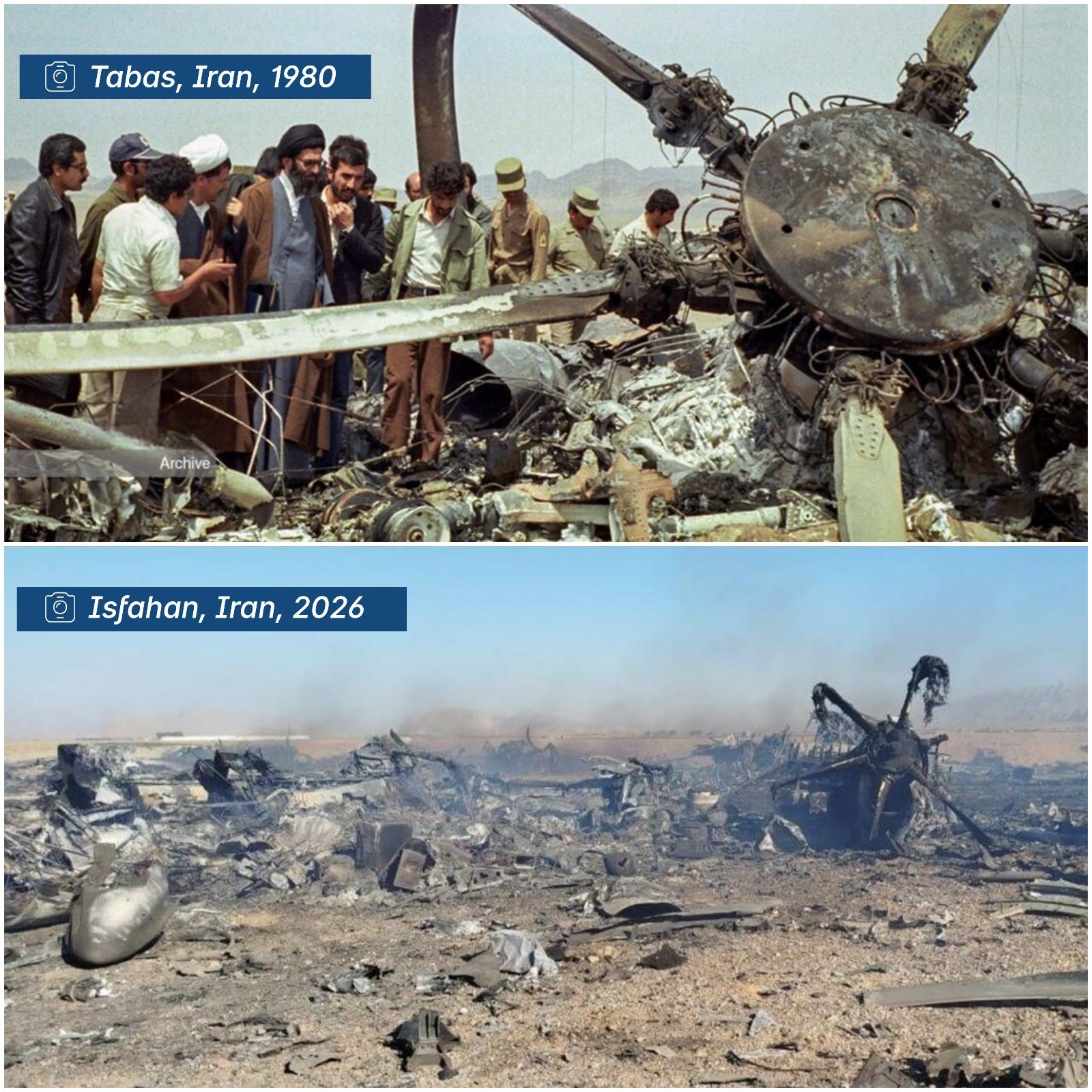 ² 大意是,1980年美军营救伊朗人质,直升机坠毁、任务失败。2026年美军营救美军,又直升机坠毁,这一次还有运输机、战斗机被摧毁,一地狼籍。