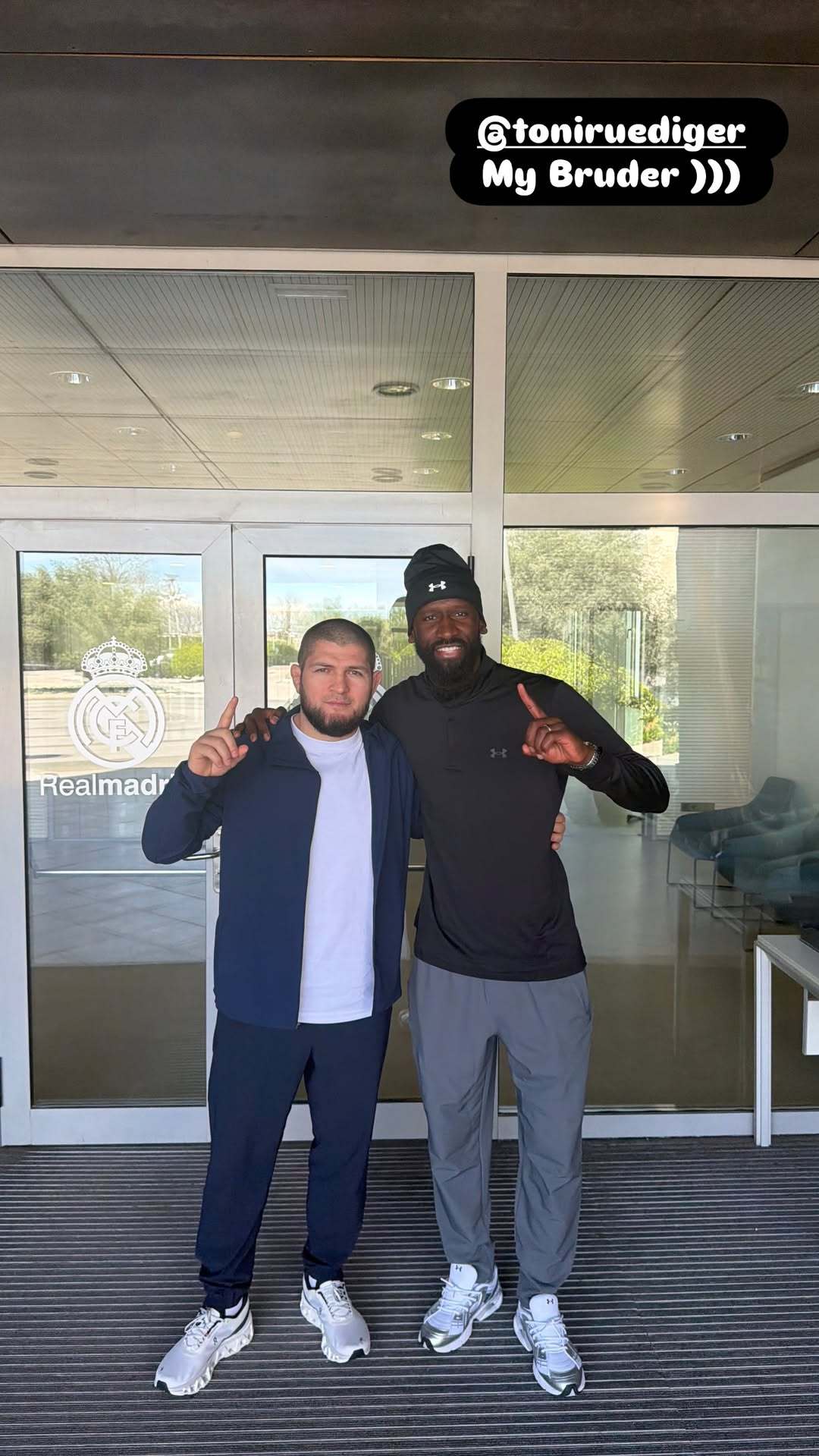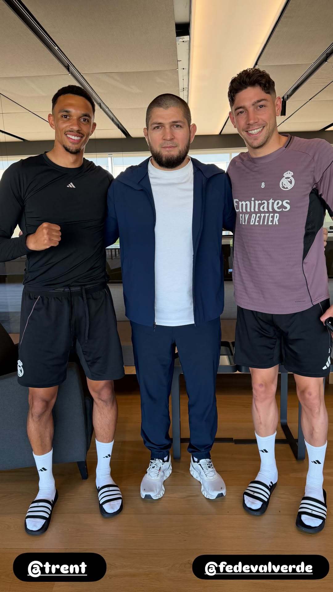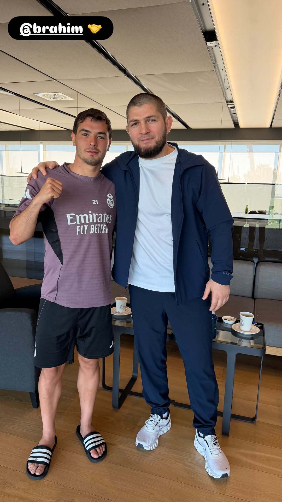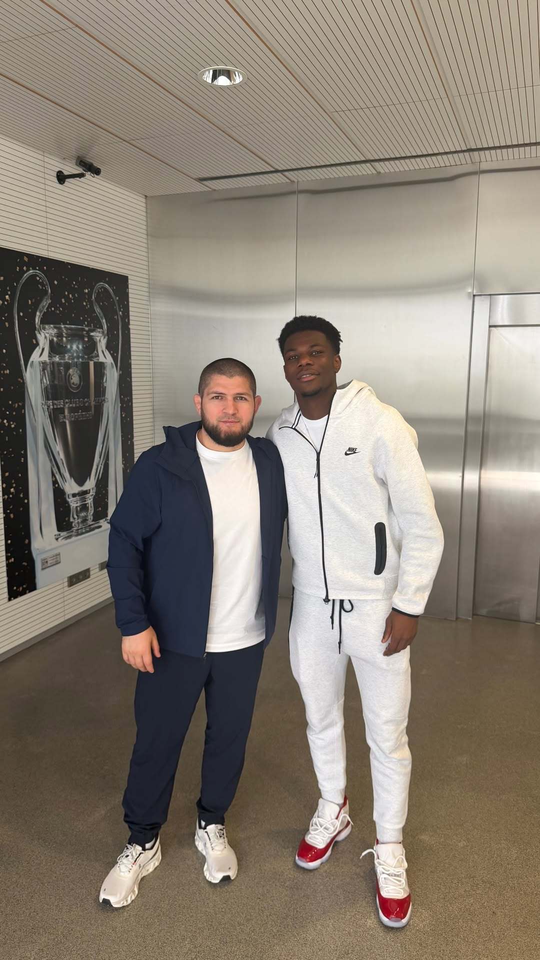 小鹰”哈比布·努尔马戈梅多夫(UFC轻量级冠军) 参观皇马训练并与球员们的合影。