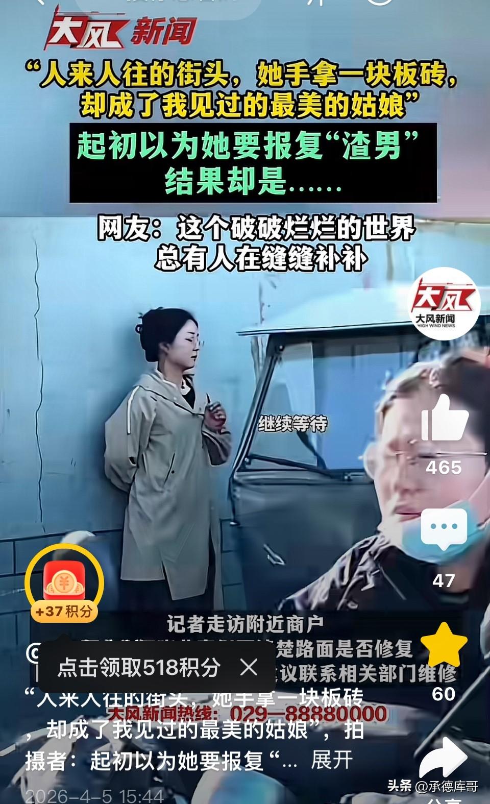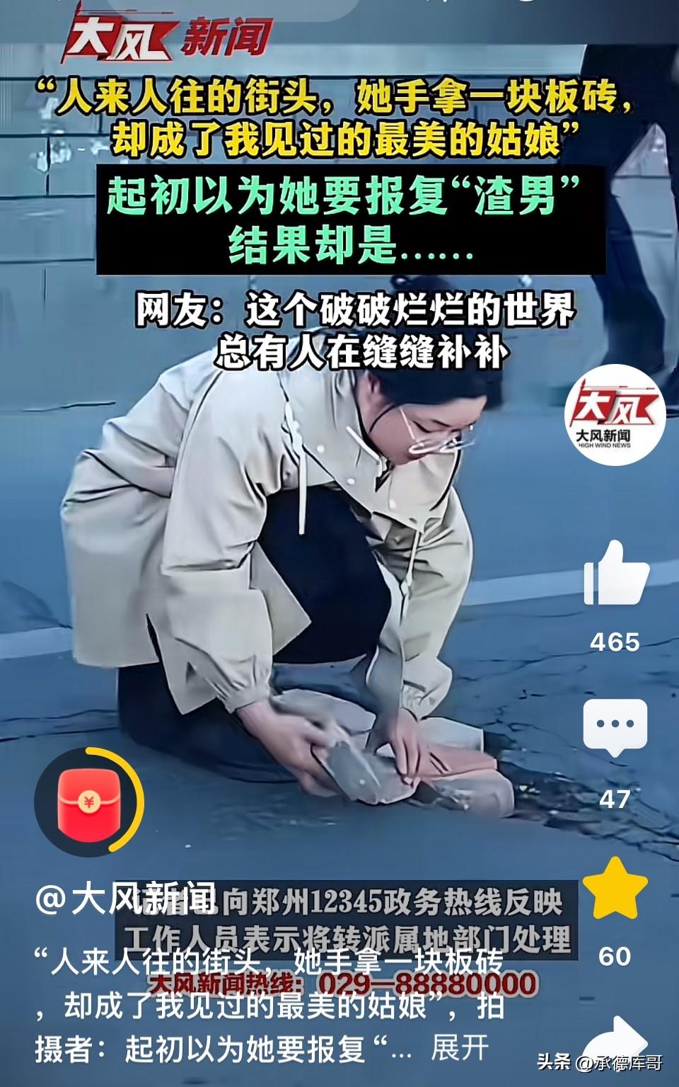人来人往的街头,一个年轻女子手握砖头,倚靠在桥洞边上,目光死死盯着马路上过往的车辆和行人,路人都对她投去好奇目光,可是她接下来的行为让人纷纷竖起大拇指! 桥洞下,一个年轻女子手握砖头,倚靠在桥洞边上,目光死死盯着马路上过往的车辆和行人。 路过的行人纷纷侧目,有人加快脚步绕道走,有人远远掏出手机偷拍几张,还有人小声嘀咕:“这女的怕不是疯了吧?”“手里拿着砖头,八成是在等仇家。”“看着挺年轻漂亮的,怎么干这种事?” 所有人都以为,她在伺机寻仇报复。 没有人知道,她在等。 等车流量变小,等一个没有车经过的间隙。 趁着那个空档,她快步冲到马路上,蹲下身子,把手中的砖头稳稳当当地塞进路面一个深坑里,摆好,压实,然后迅速回撤到马路边。 她并没有离开。她又拿起一块砖头,继续靠在桥洞边上,继续注视着车流,继续等待下一个“空档”。 一块,两块,三块…… 原来,那个坑她早就注意到了。坑不大,但足以让一个骑电动车的人颠簸失稳,足以让一辆摩托车在雨天打滑摔倒。没人管,没人修,她就自己来。 路人的眼神从警惕变成了惊讶,从惊讶变成了羞愧,最后变成了敬佩。 ——这就是我们生活的世界。做好事的人,往往先被当作坏人。因为我们太习惯用恶意去揣测一个我们不理解的举动。 女子手中的砖头,砸碎的不是车窗,而是这个社会的冷漠。她没有喊口号,没有发朋友圈,没有找媒体,只是默默地在等,默默地填。 而那些围观的路人,除了猜疑和拍摄,没有人走上前去问一句:“需要帮忙吗?” 我想起一句话:这个社会最大的问题,不是坏人太猖狂,而是好人太沉默。 好在,还有人愿意沉默地做好事。 向这位“砖头姑娘”致敬。也希望下次看到类似场景时,我们能放下猜疑,走上前去,一起把坑填上。