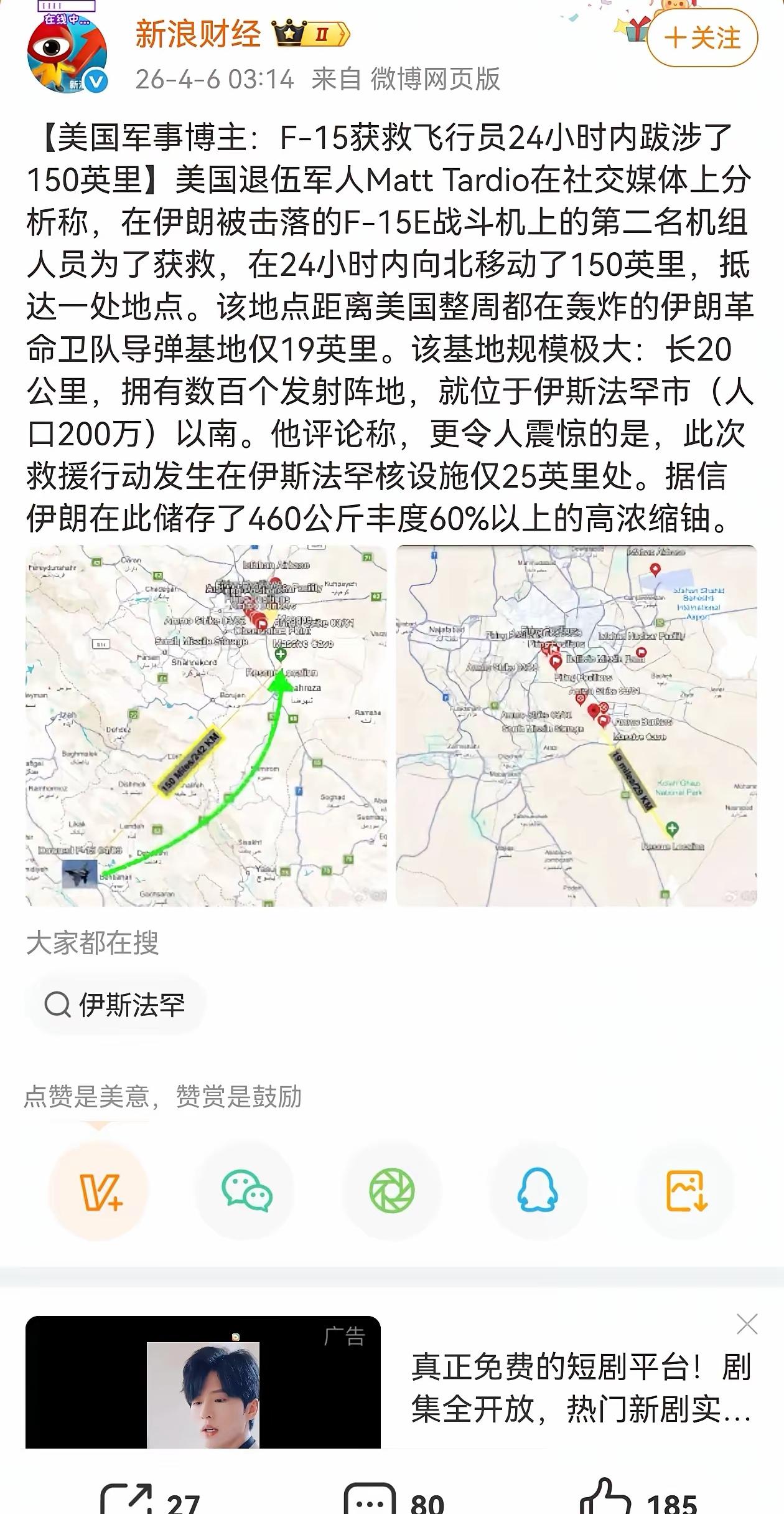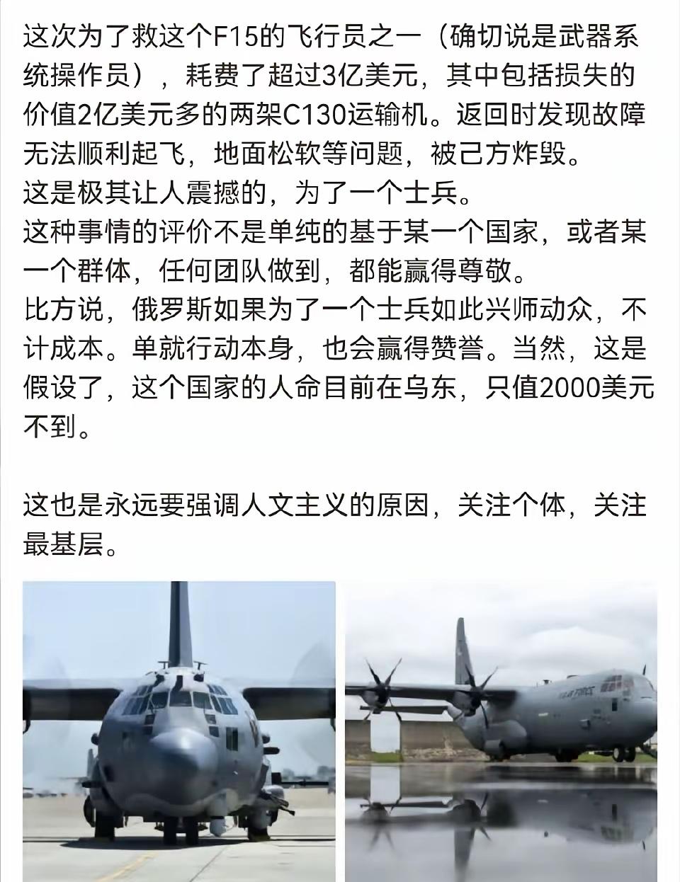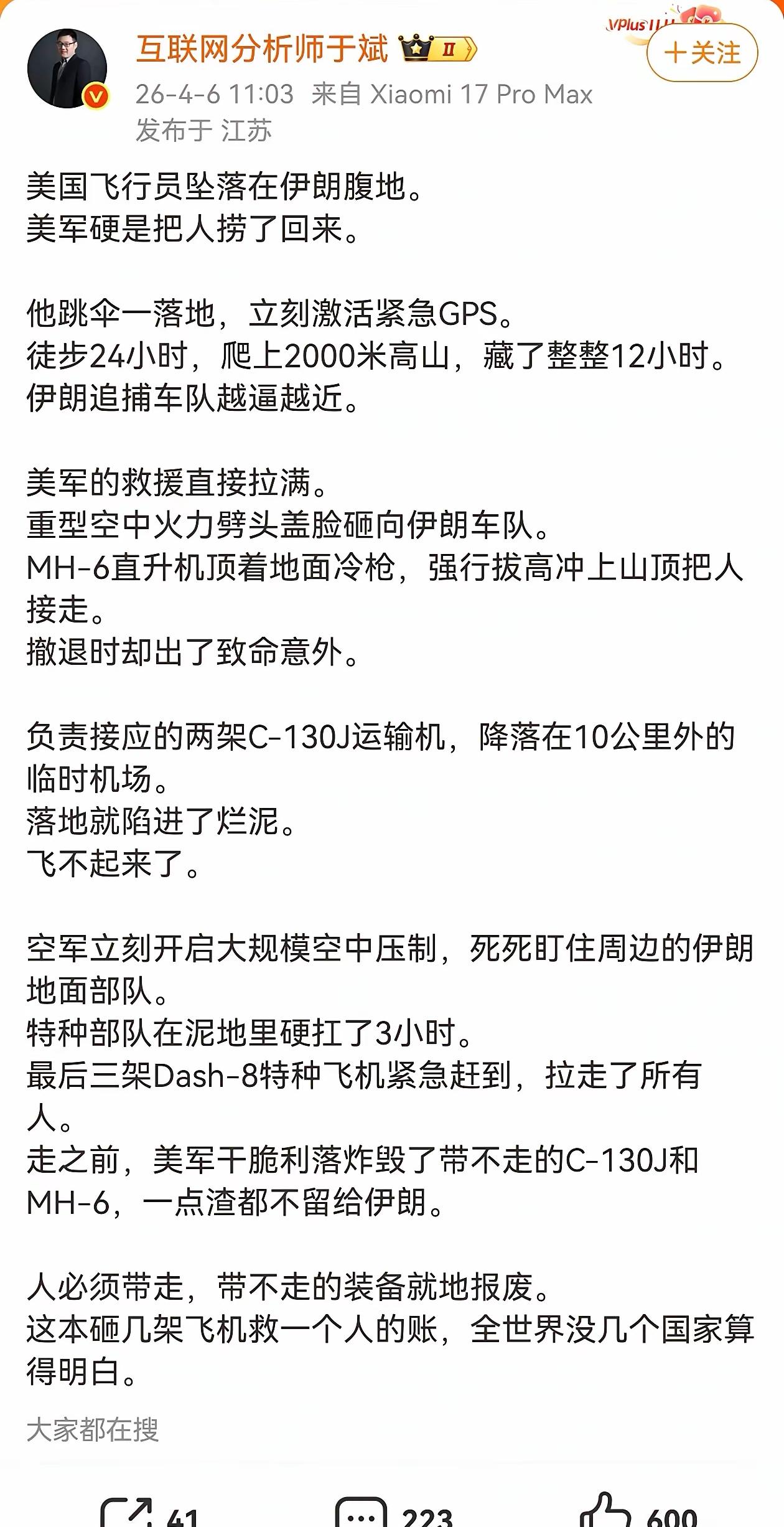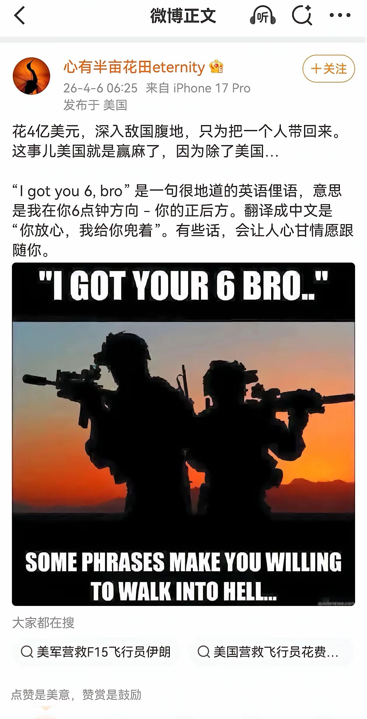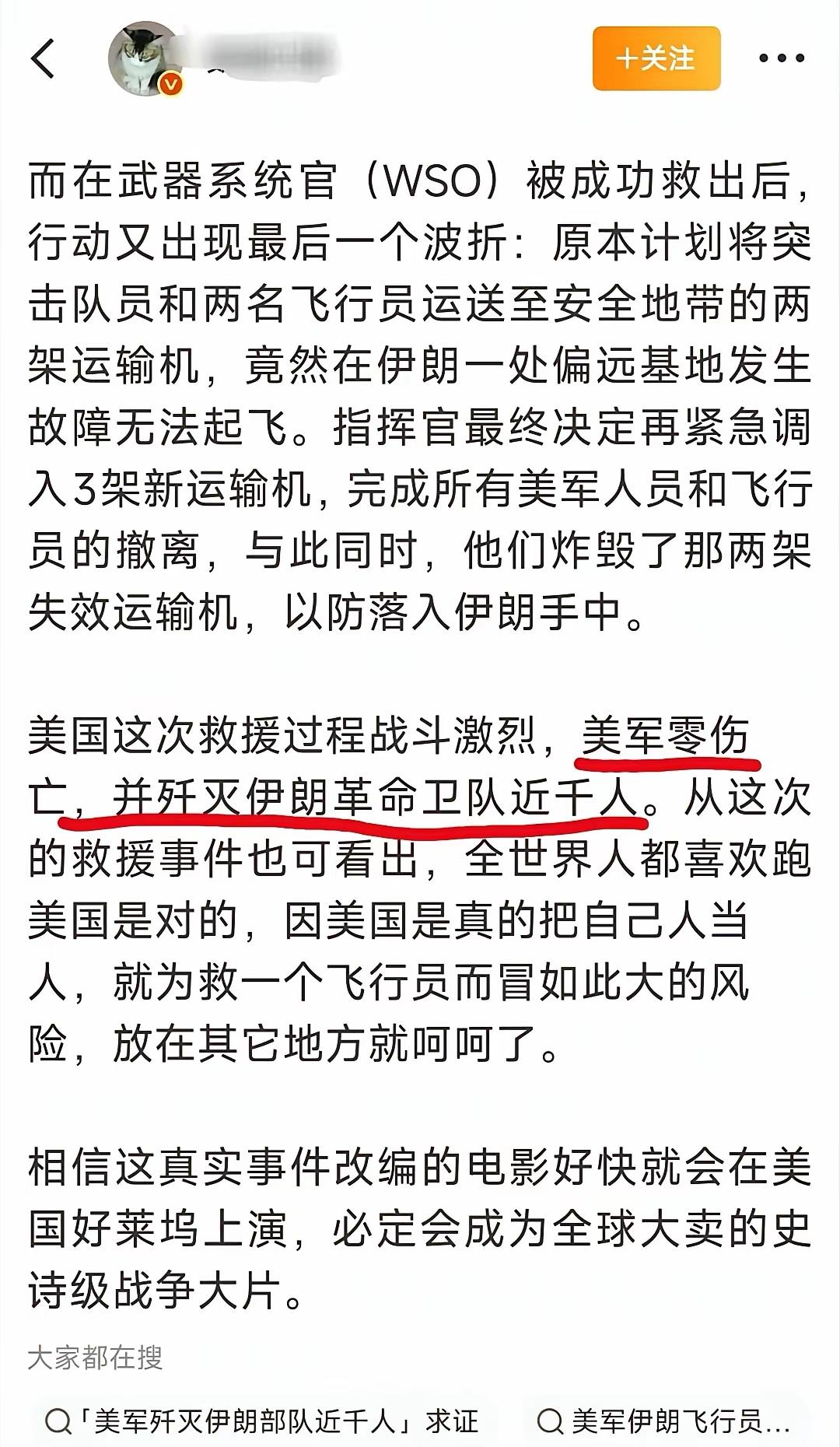 项立刚:叹服美国强大的宣传能力。 对于美国拯救两名飞行员,项立刚说:“我也不由叹服美国在造舆论上的能力,而且是敢投入、愿意投入。” 其实我也被我们内网这些软文通稿所叹服了,这也侧面印证了项立刚的话,老美在舆论上是敢投入、愿意投入。连我们国内都有一群人,写着大同小异的通稿,盛赞美利坚。在他们眼里、笔下,美利坚是无所不能的人类光辉(其实就是侵略者),连他们的士兵都是“超人”,24小时能够完成6个马拉松,急行军150英里合计241公里,还爬上了两千英尺的高山藏在了石头缝了。这已经不是人类了,是超级战士。 而这期间,损失了1架F-15E,1架A-10C、1架MQ-9无人机、2架HH-60W救援直升机、2架- HC-130J 特种运输机,这个规模不像是救人,更像是去完成特种作战任务。而伊朗方面说打死了不少美军,但美方不承认。 其实不管美军如何拯救、是不是特种作战任务失败。作为侵略者,如果真那么在乎士兵的性命,就不该出现在别人的领土上摧毁别人的家园。没有侵略,就没有死亡。 但这件事情让我觉得更可怕的是,正如项立刚所说的,美方舆论宣传的强大。可为何我们国内会出现这么多通稿?这些人难不成就是拿了经费的?要引起重视啊!