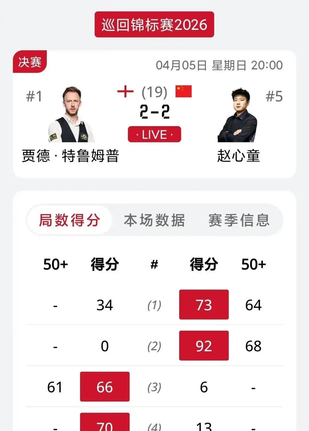 赵心童2-2追平特鲁姆普,却埋下大隐患!这盘棋特鲁姆普已经赢了半子 斯诺克这场强强对话太有看头,赵心童和特鲁姆普前四局战成2-2平,不少球迷觉得小赵能跟顶尖高手掰手腕已经足够亮眼,但明眼人都能看出来,现在形势对赵心童其实很不利。 特鲁姆普根本不跟赵心童拼进攻,全程改打磨人的防守,专门磨小赵的节奏,还连续做了三杆斯诺克困住对手。 本来赵心童今天中袋手感就发飘,被这么一耗,失误越来越多,要是后半段找不到破解防守的办法,赢球真的难。
