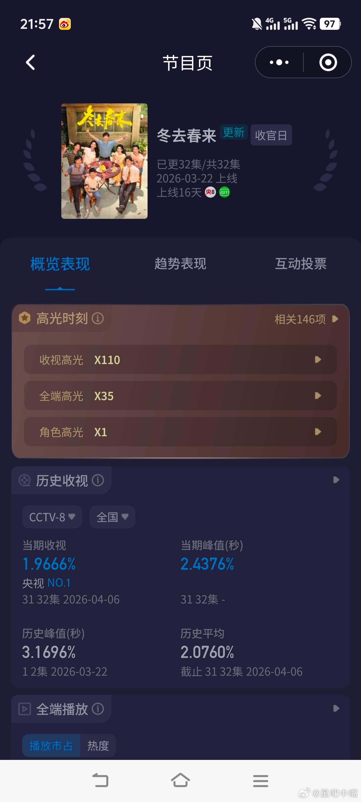 冬去春来今晚央八大结局酷云大涨!峰值2.4376,平均1.9666,cvb估值: