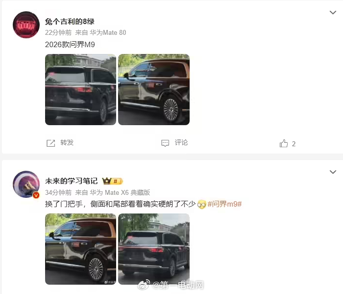 多个博主曝光2026款问界M9无伪装实车,门把手有望改为尊界 S800 同款的“九天星辰”设计