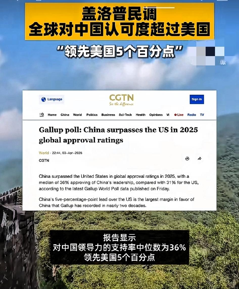 中国在全球认可度方面超过美国---美国民调机构盖洛普公司2025 中国领导力中位数36%,超过美国5个百分点。这是该民调机构近20年来记录中国在全球认可度上,对美国领先幅度最大的一次。 评一下: 盖洛普最新数据——中国领导力全球认可度中位数36%,美国只有31%。中国反超5个百分点,创下近20年来最大领先幅度。要知道,2017年美国还领先中国15个点呢。这反转,够狠。 凭什么?简单说:中国在“干活”,美国在“甩锅”。 过去一年,中国斡旋沙特伊朗复交、推动金砖扩员、一带一路项目实打实落地——非洲的铁路、东南亚的电站、中东的基建,看得见摸得着。而美国呢?从阿富汗仓皇撤军到俄乌战场“递刀”,嘴上喊着“回归”,行动上却让盟友越来越没安全感。发展中国家看得最明白:中国不搞价值观绑架,不谈“你站哪边”,只问生意怎么做、路怎么修。 更深层的变化是:全球南方国家不再迷信西方剧本。当美西方忙着制裁、选战、内斗,中国却稳扎稳打搞发展。老百姓的直觉最准——谁能带大家赚钱,谁真心尊重别人,票就投给谁。 这次民调像一面镜子:世界的信任,正在悄悄易主。